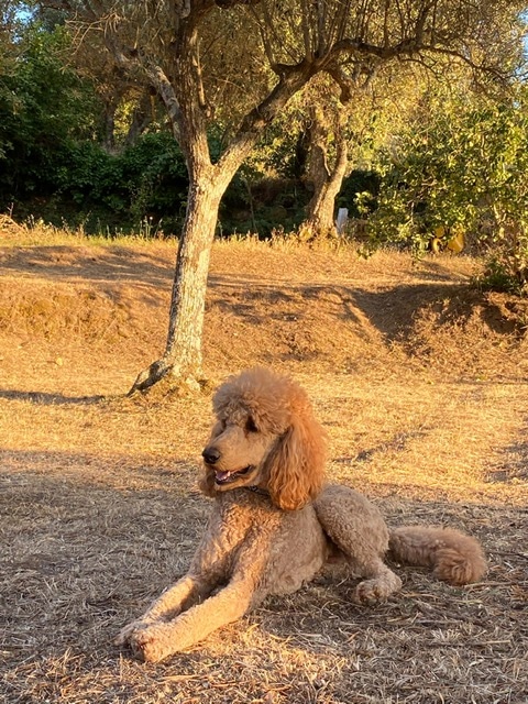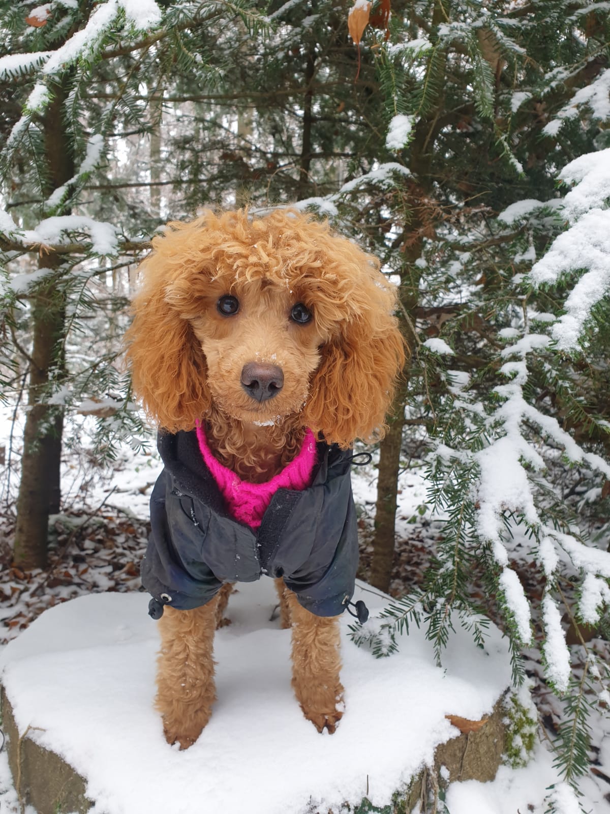 Fine, das rote Zwergpudelmädchen, ist unser verfressener Räuber. Sie fegt wie ein Wirbelwind durch den Wald, buddelt daheim gerne in den Blumen, freut sich über jeden Spaziergänger und ist manchmal ganz schön frech zu Malu. Sie zaubert uns jeden Tag ein Lächeln ins Gesicht, wenn sie rumblödelt. Michelle