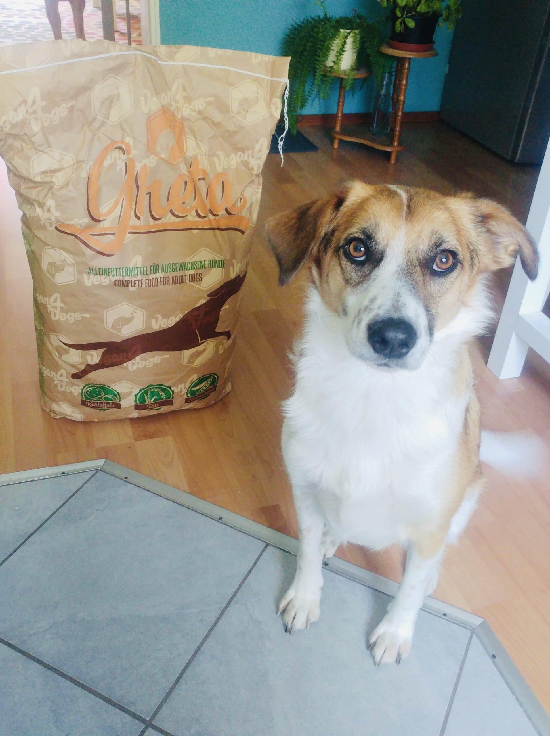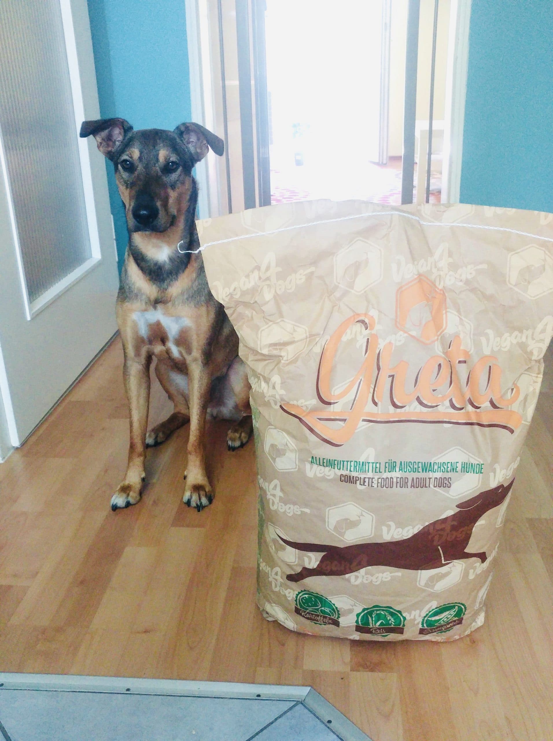 Mein geretteter Hund Breeze, Lurcher (weiblich, Greyhound x Whippet x Deutscher Schäferhund) hat früher an vielen Nahrungsmittelallergien (Fleisch, Mais) gelitten. Als ich sie aus dem Tierheim adoptierte, war sie 12 Wochen alt und bekam Futter auf Fleischbasis. Ich wechselte langsam auf ein veganes Hundewelpenfutter. Als sie erwachsen wurde, zu veganem Bio‑Hundefutter für Erwachsene, aber sie hatte immer wieder Probleme mit ihrer Haut, ihrem Fell und Stuhl. Also habe ich sie wieder auf eine andere Marke veganes Hundefutter umgestellt. Es ging ihr viel besser, aber später entwickelte sie eine Maisallergie und musste sich jedes Mal übergeben, wenn sie etwas mit Mais darin bekam (das fanden wir später raus). Es war der Mais in der Nahrung. Sie kann es nicht mehr haben. Schließlich erfuhr ich von dem veganen Hundefutter Greta und sie bekommt dieses seit längerer Zeit. Sie ist jetzt 4 Jahre alt und sehr gesund und liebt das Leben! Dieses Futter ist das Beste für sie. ♥