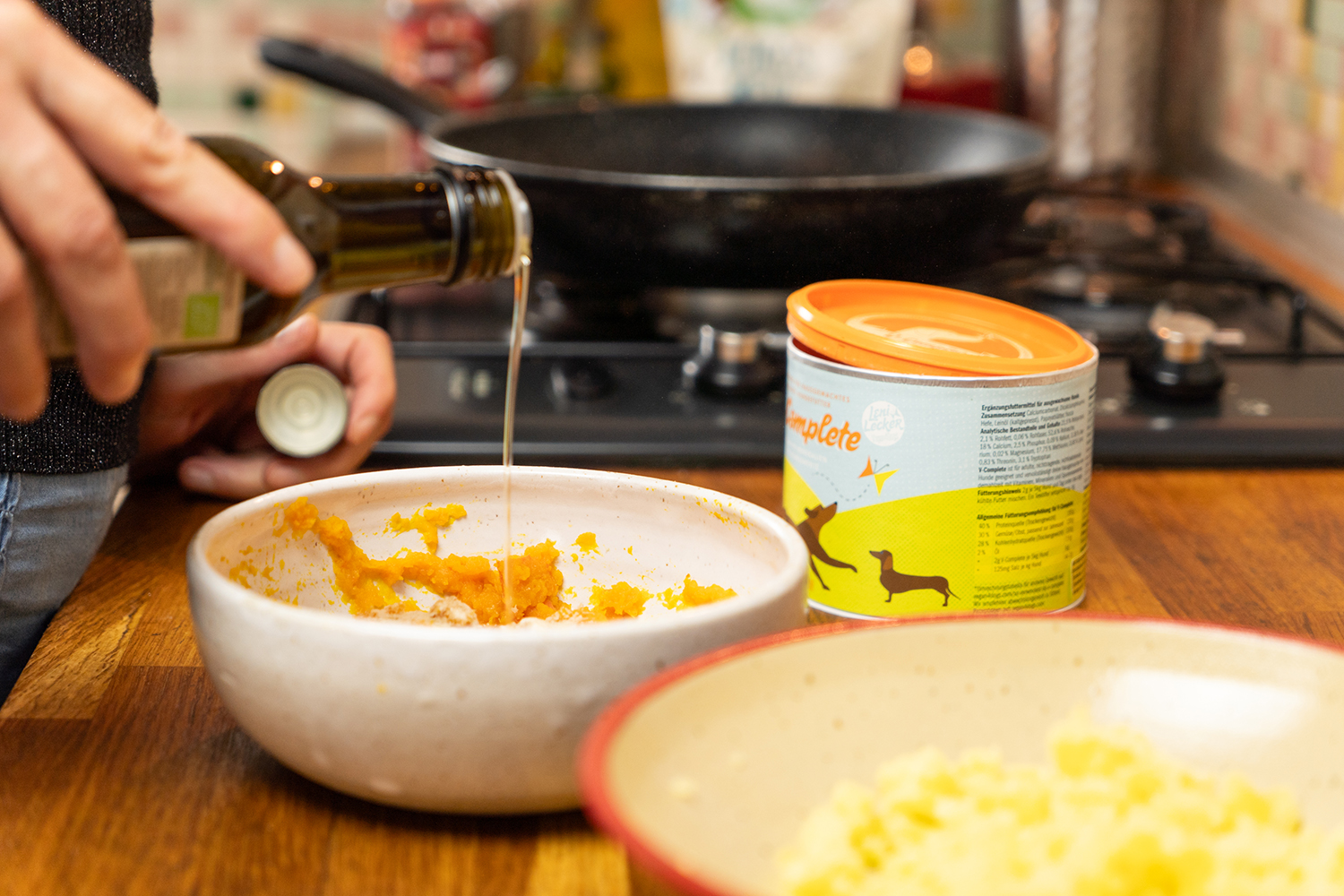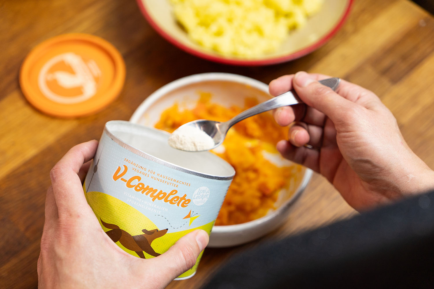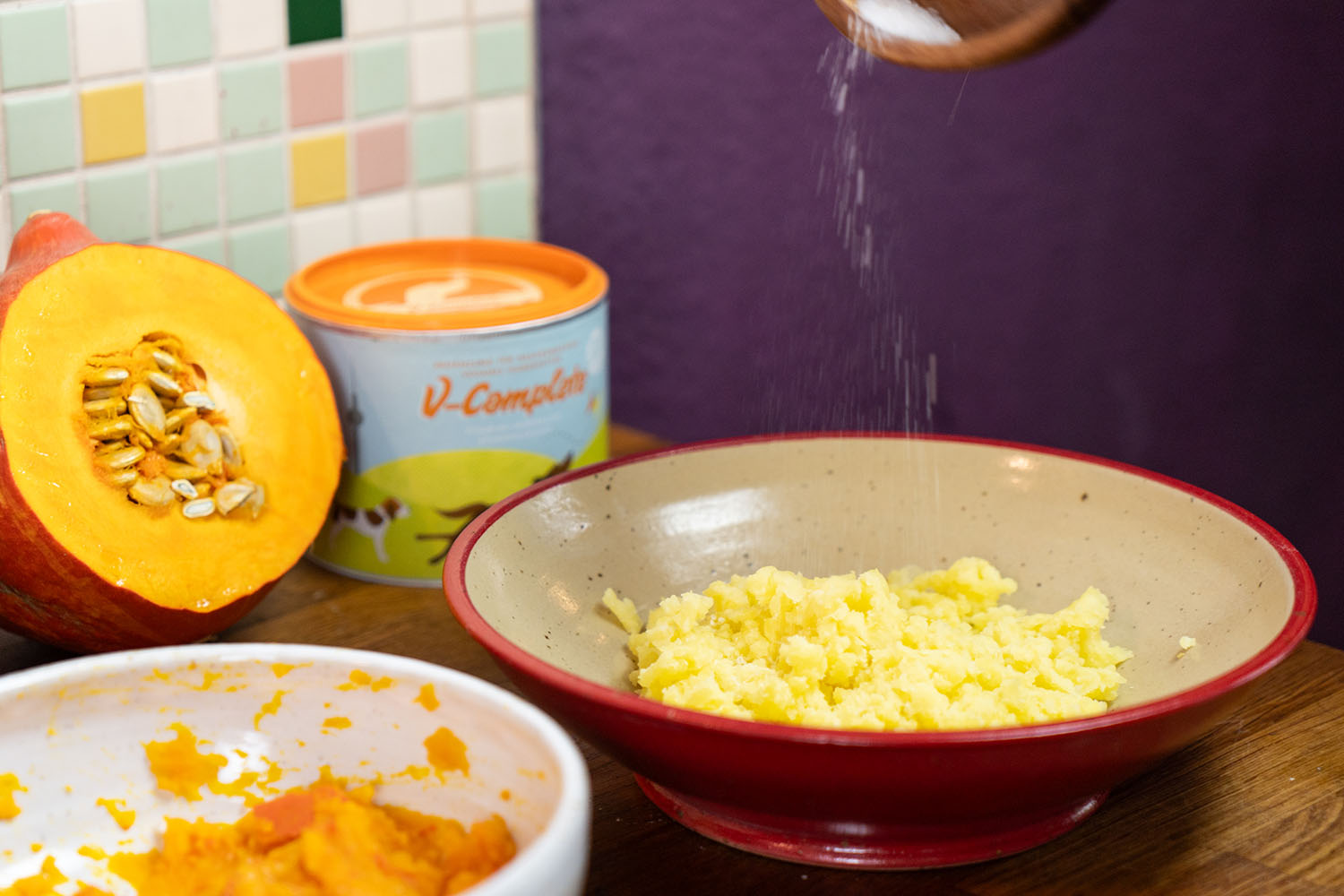 Pumpkin, potatoes, lentils, tofu and dog? The perfect combination in winter. And this Christmas recipe is not only delicious for our canine companions, but is also great for filling our tummies. So there's no double effort and we can feast together. Simply omit V-Complete for your plate and everything fits.