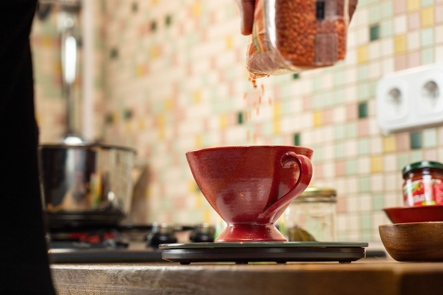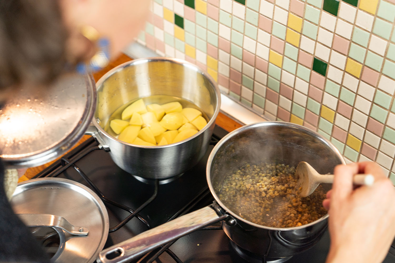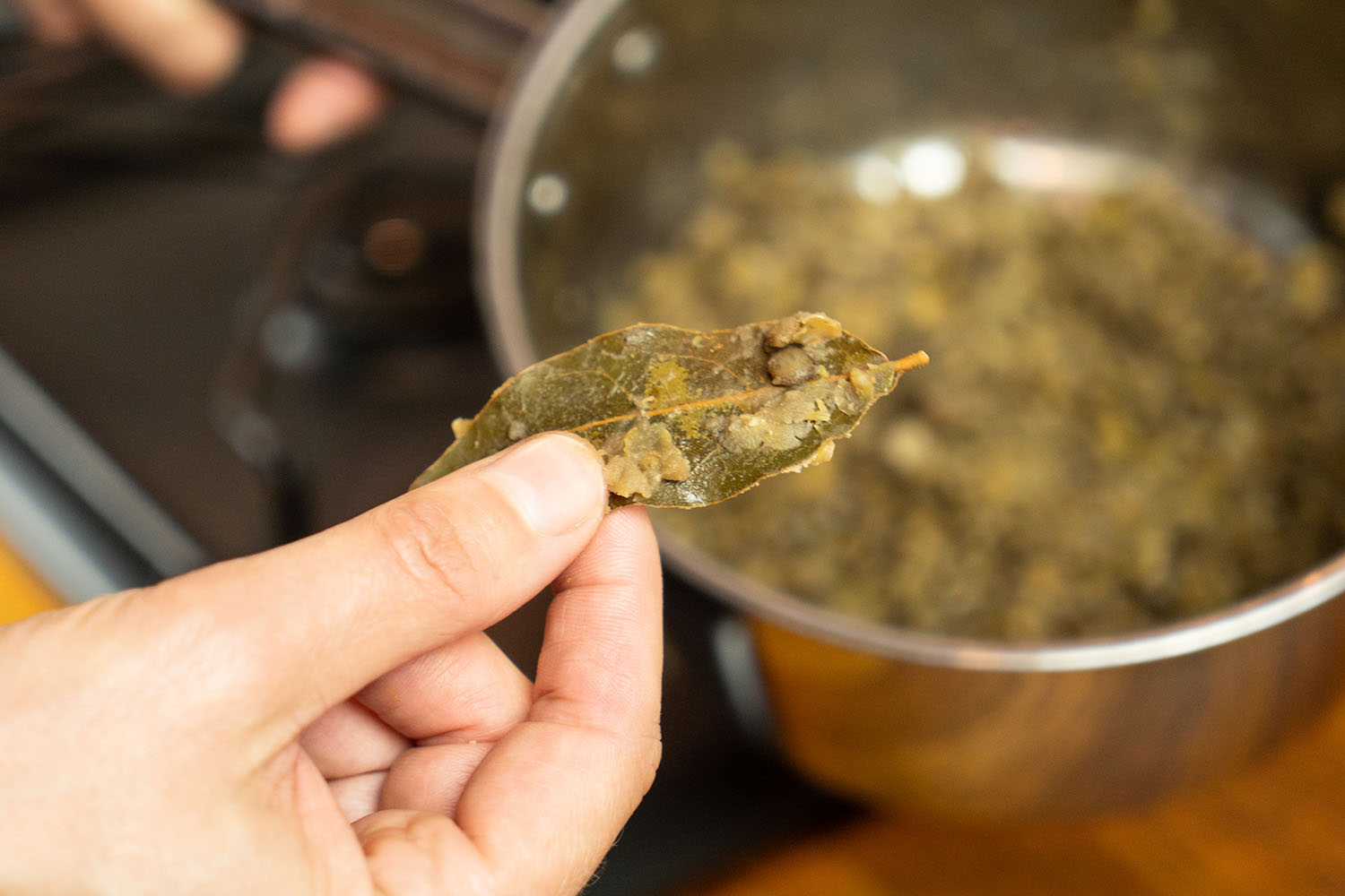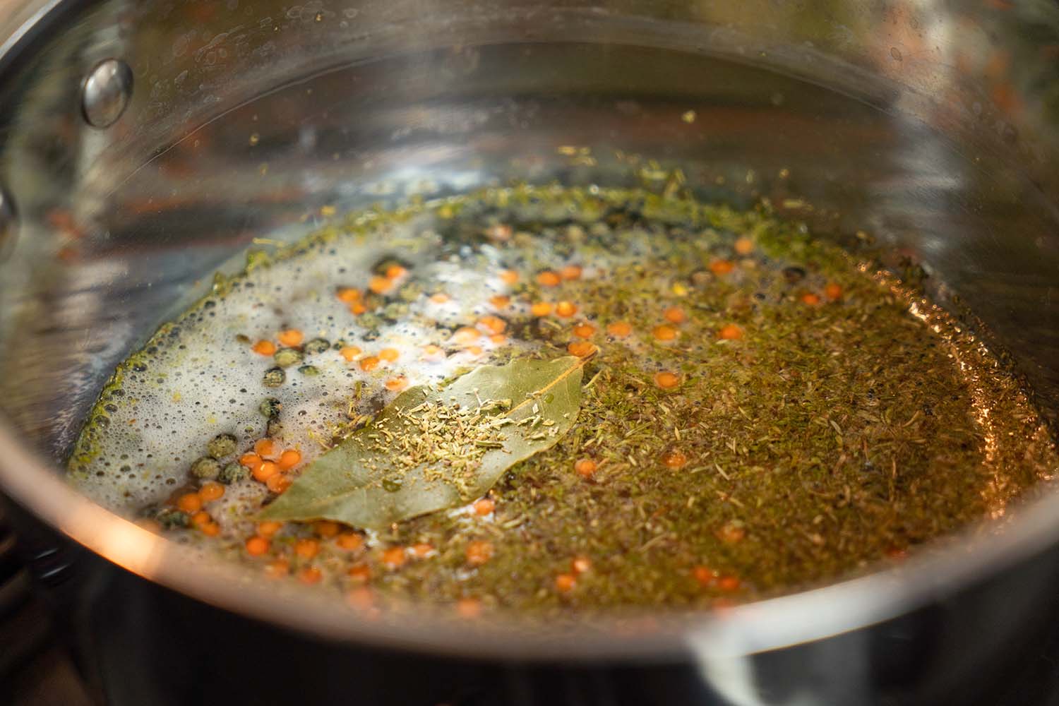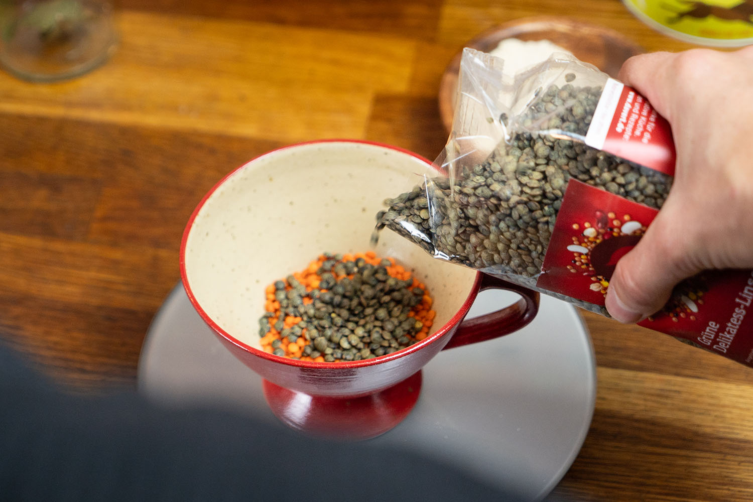 Cook the lentils with a little savoury and bay leaves. I opted for a mix of red and green lentils. However, you can also use just one type.