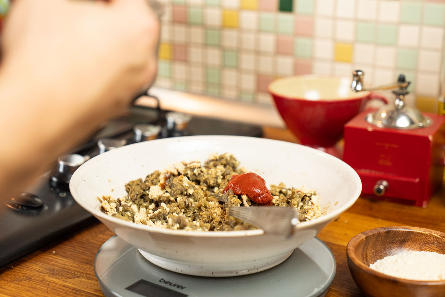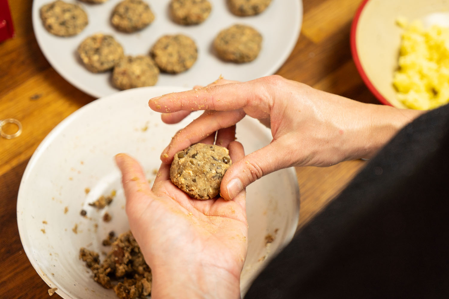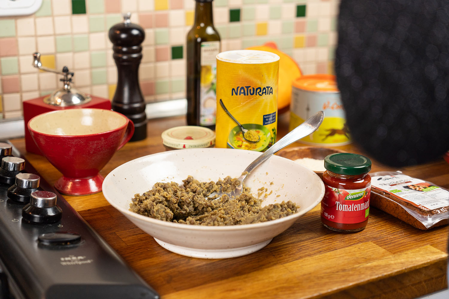 Finely crumble the smoked tofu and add to the lentils. Also add the coconut flour, cumin, tomato paste and nutritional yeast. Mix everything well and shape into bite-sized patties.