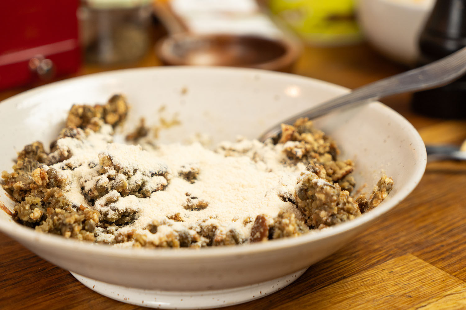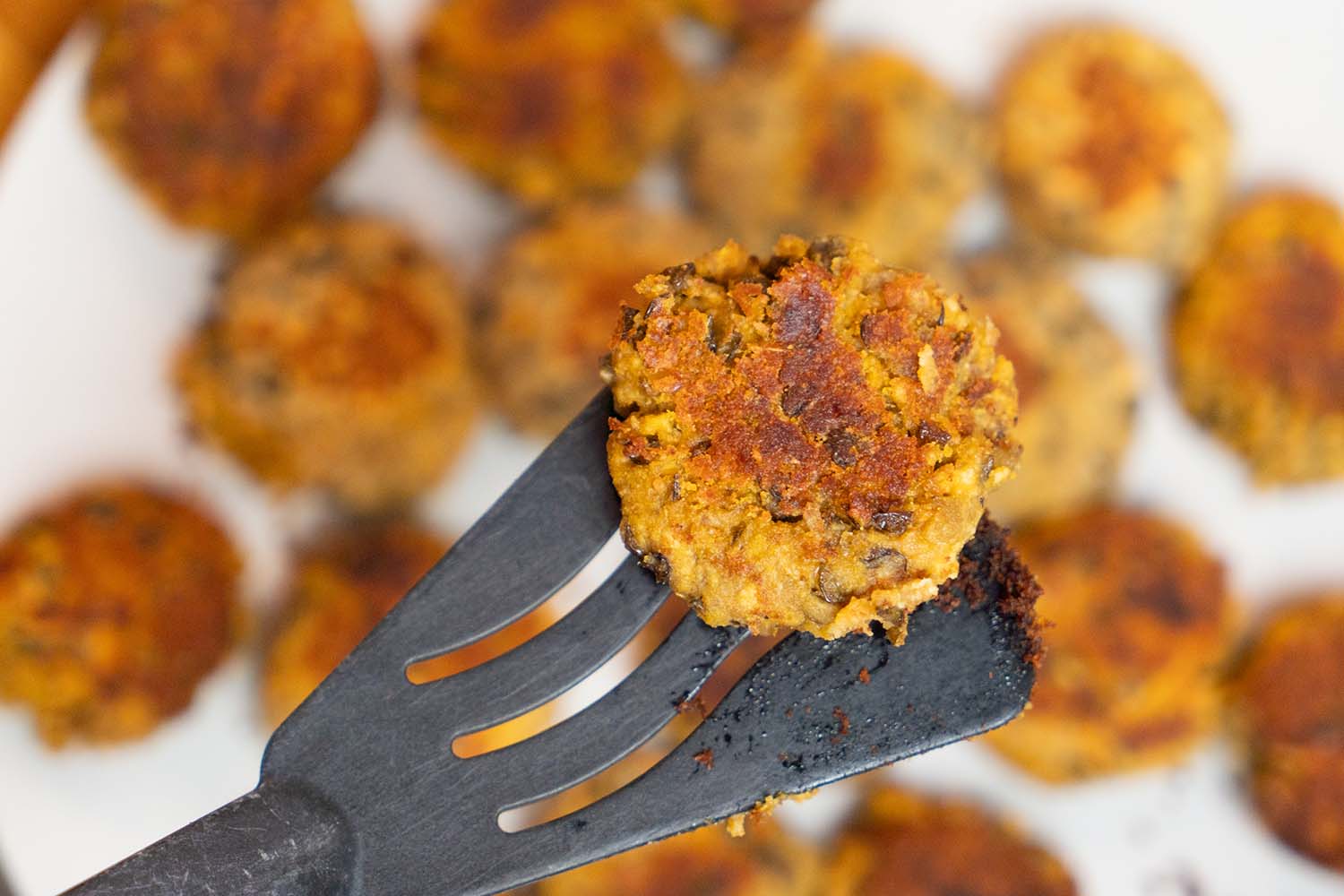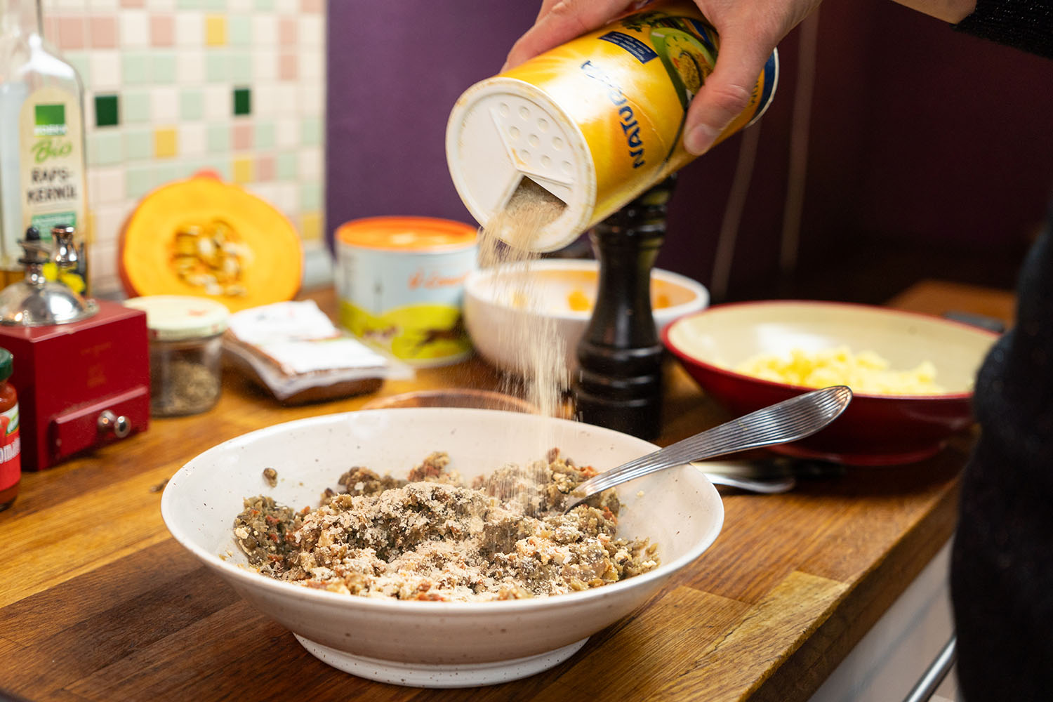 Finely crumble the smoked tofu and add to the lentils. Also add the coconut flour, cumin, tomato paste and nutritional yeast. Mix everything well and shape into bite-sized patties.