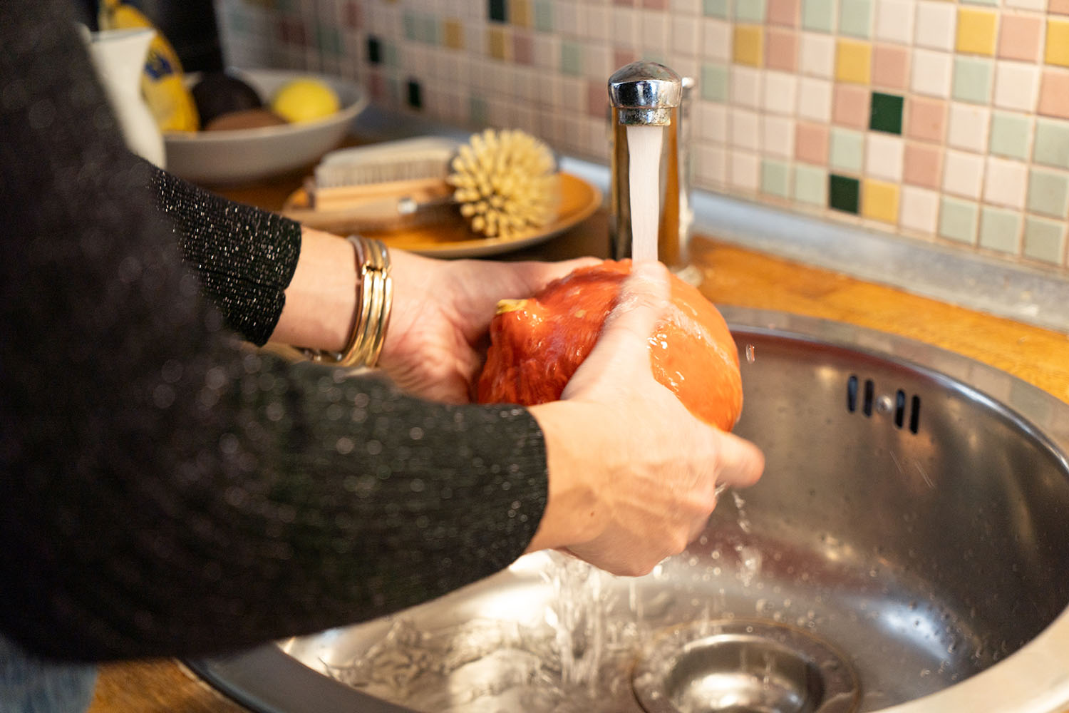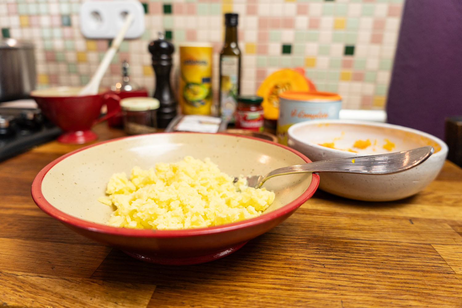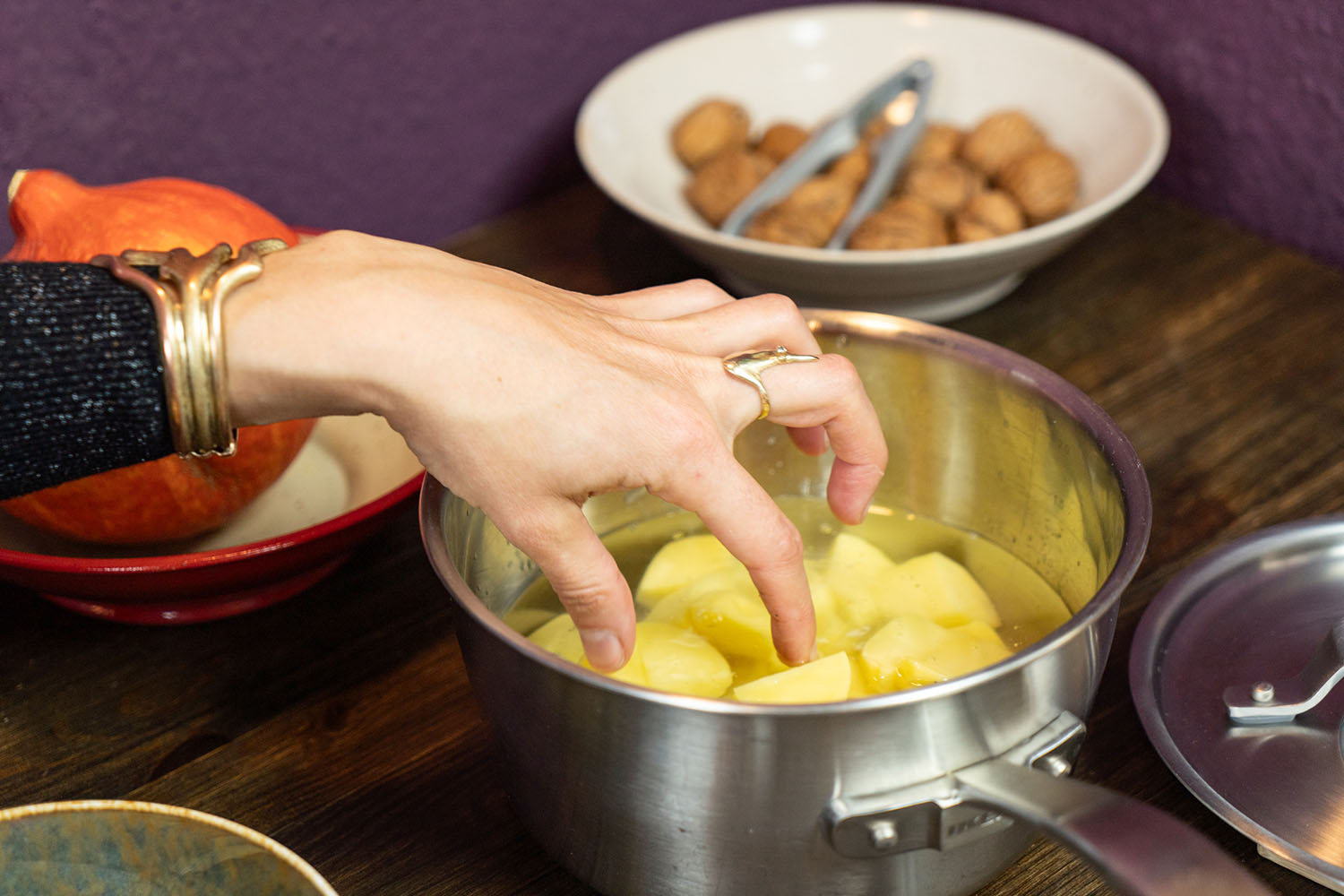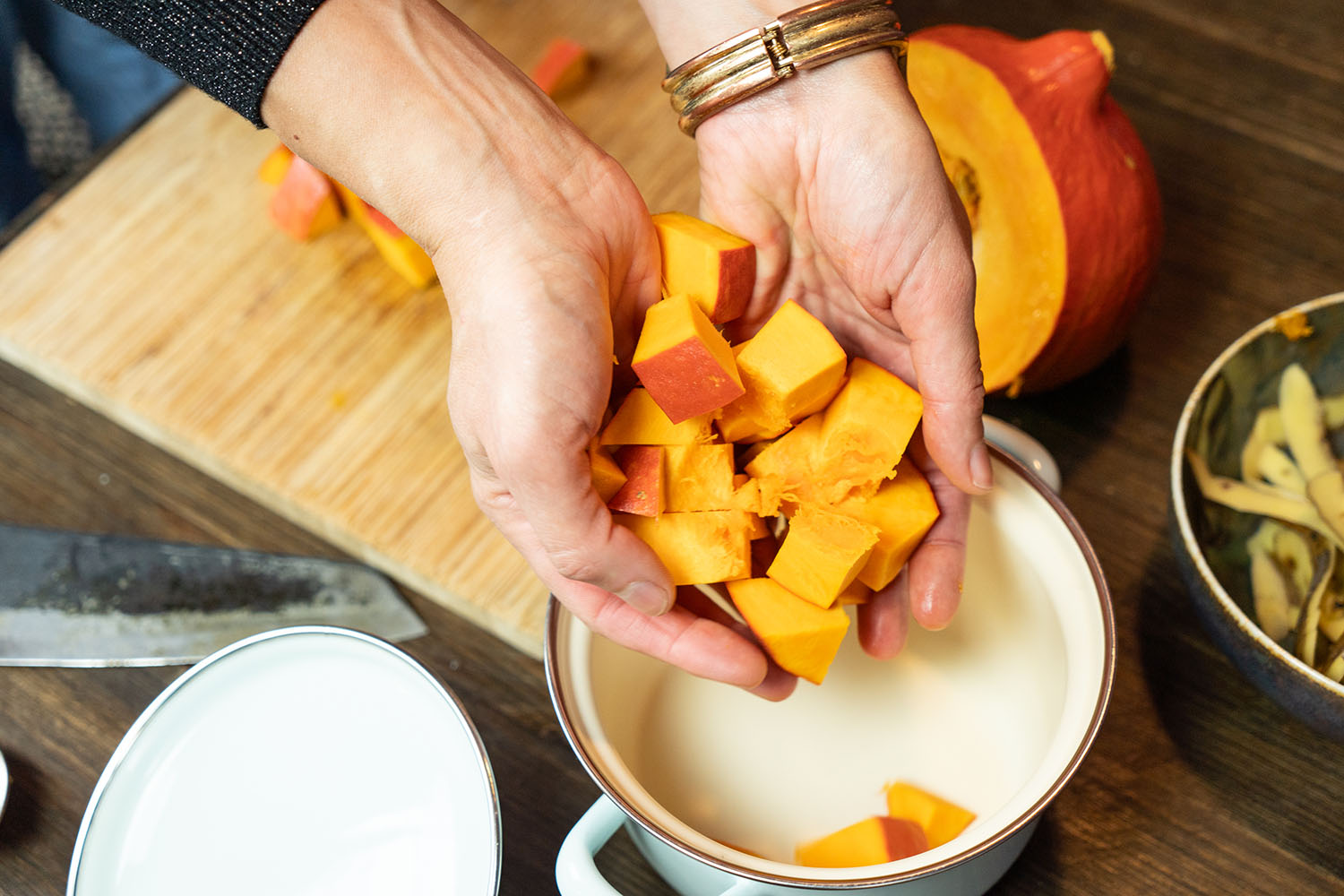Wash the pumpkin, cut into small pieces and cook with a little water in a closed pan over a low heat. Tip: Add some lovage at the end of the cooking time. This gives the pumpkin a delicious savoury flavour. (Unfortunately, I forgot to add it during the photo shoot π€«).