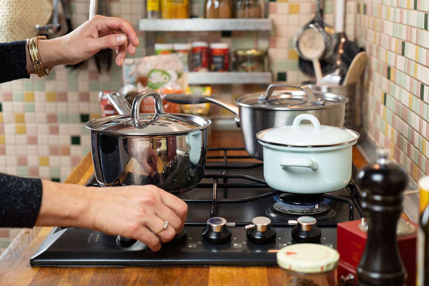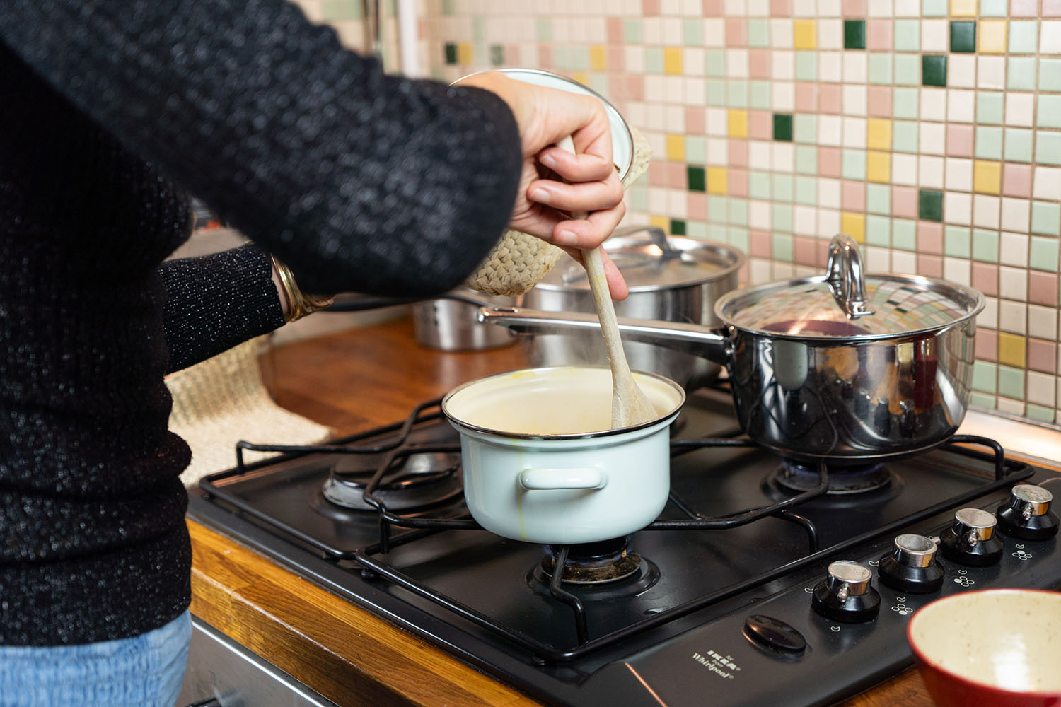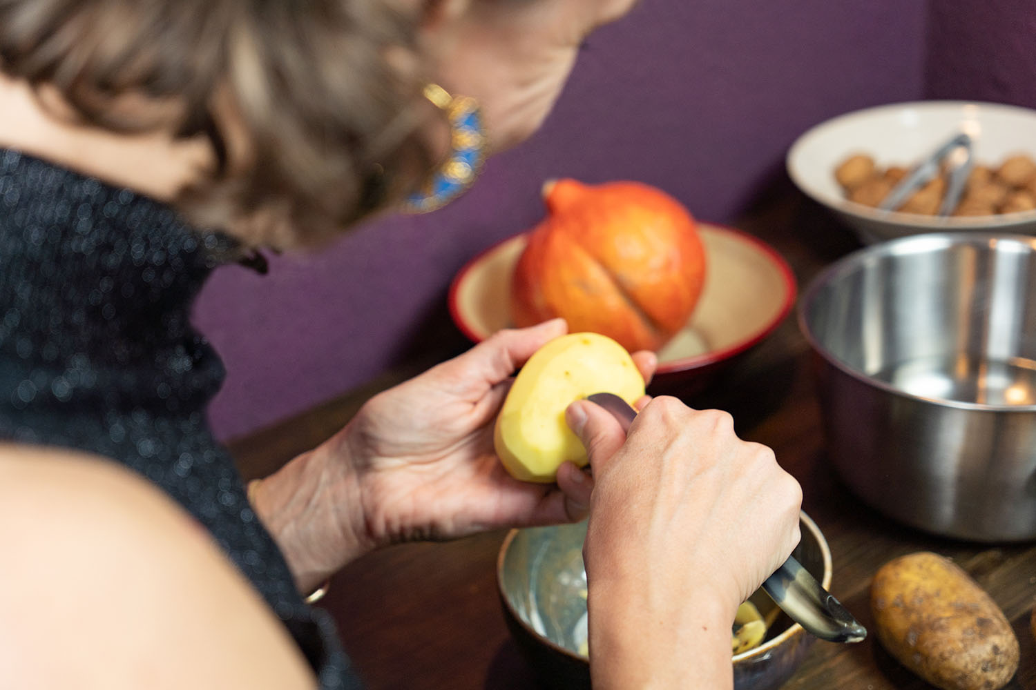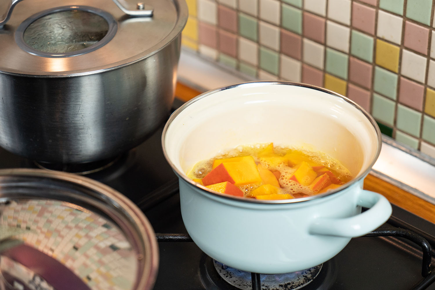 Wash the pumpkin, cut into small pieces and cook with a little water in a closed pan over a low heat. Tip: Add some lovage at the end of the cooking time. This gives the pumpkin a delicious savoury flavour. (Unfortunately, I forgot to add it during the photo shoot π€«).