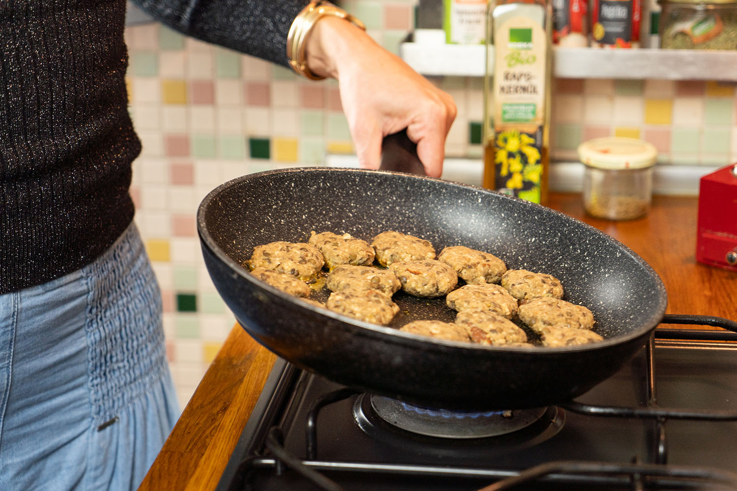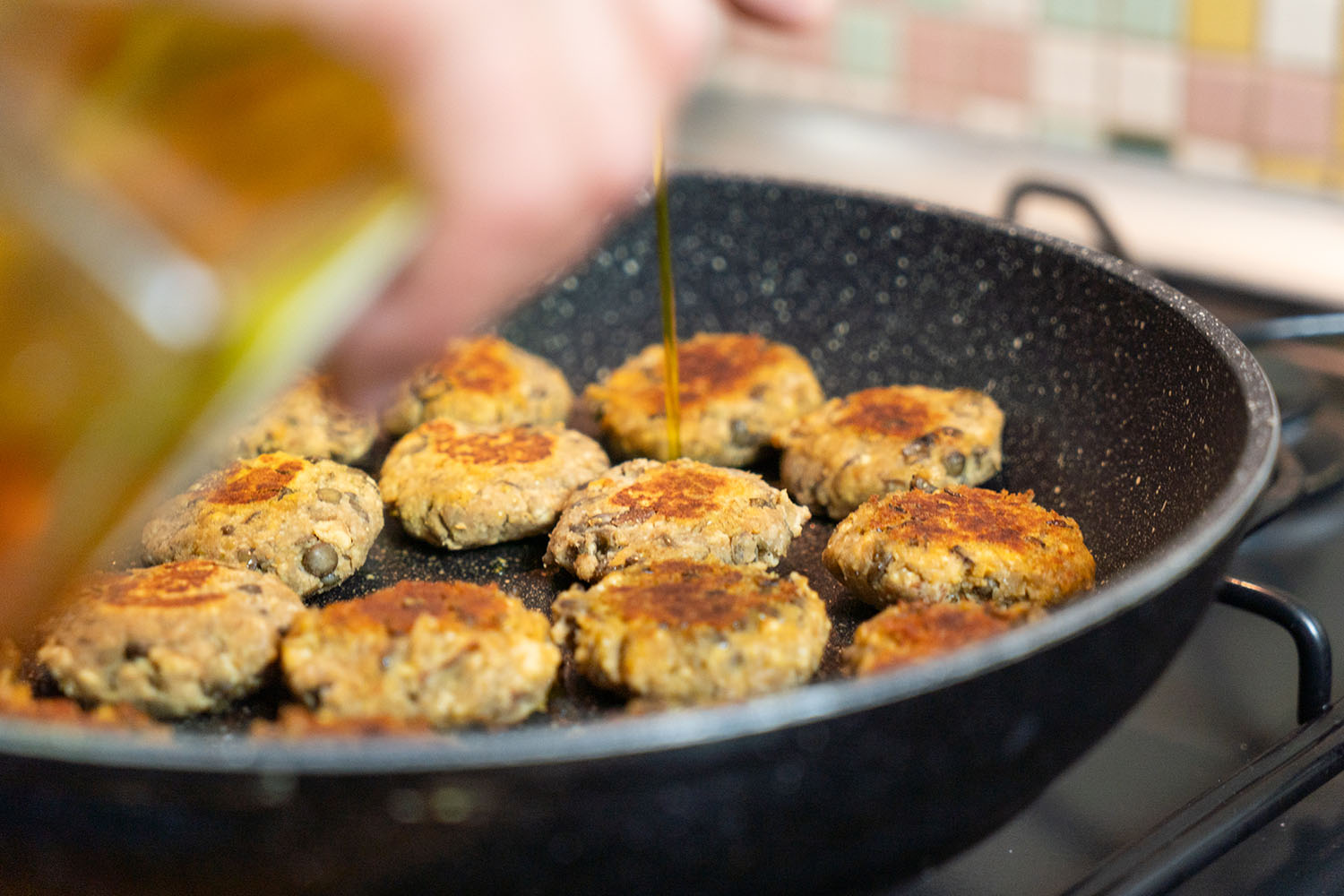 Now it's time to fry. Heat some of the canola oil in a pan and fry the patties over medium heat until brown and crispy on both sides. Then leave to cool on a plate.