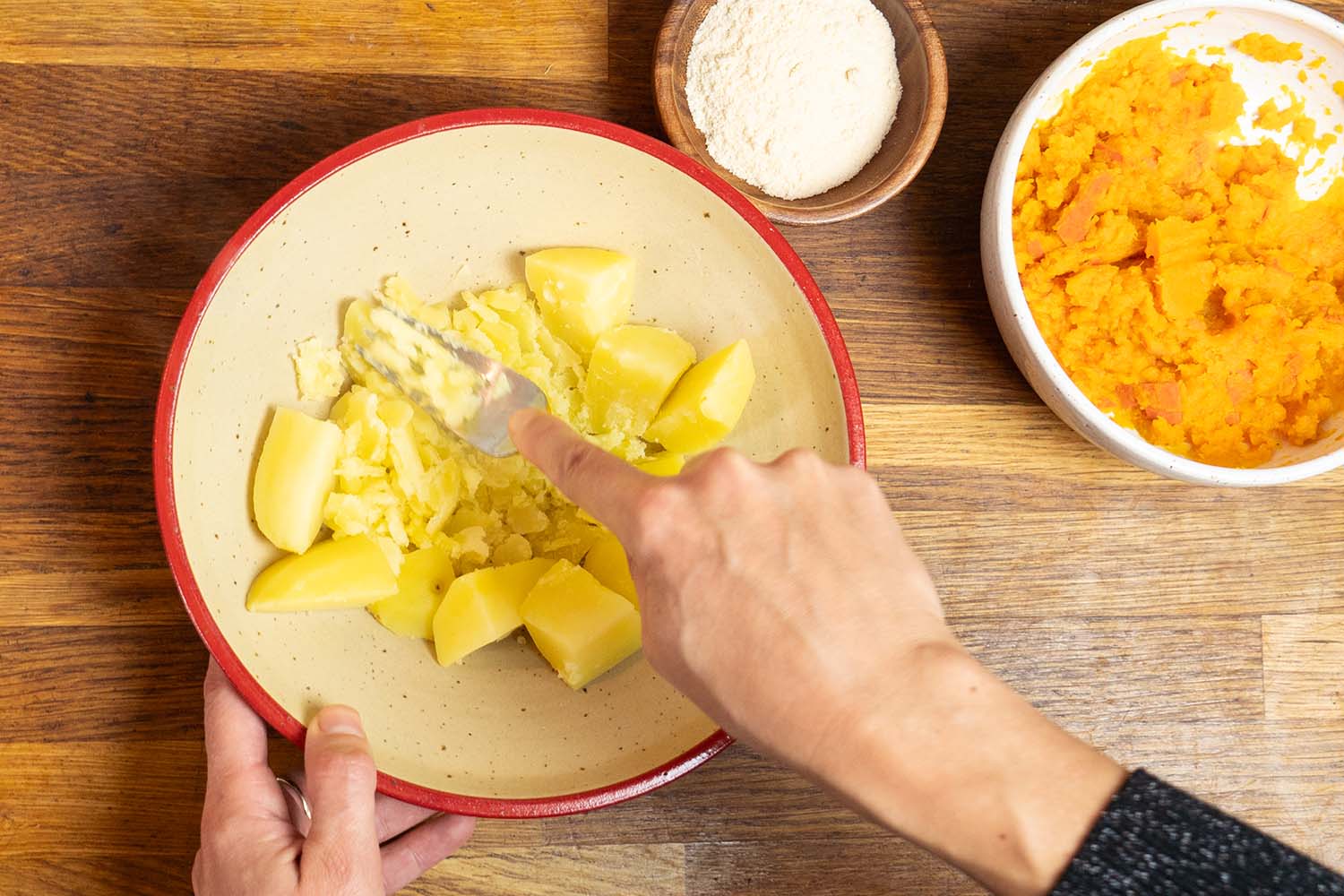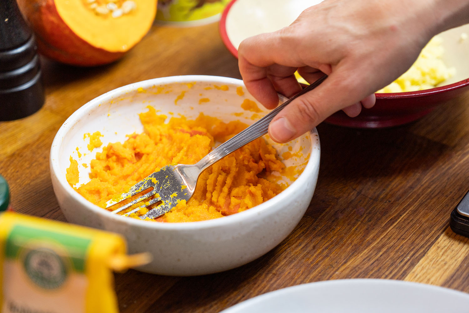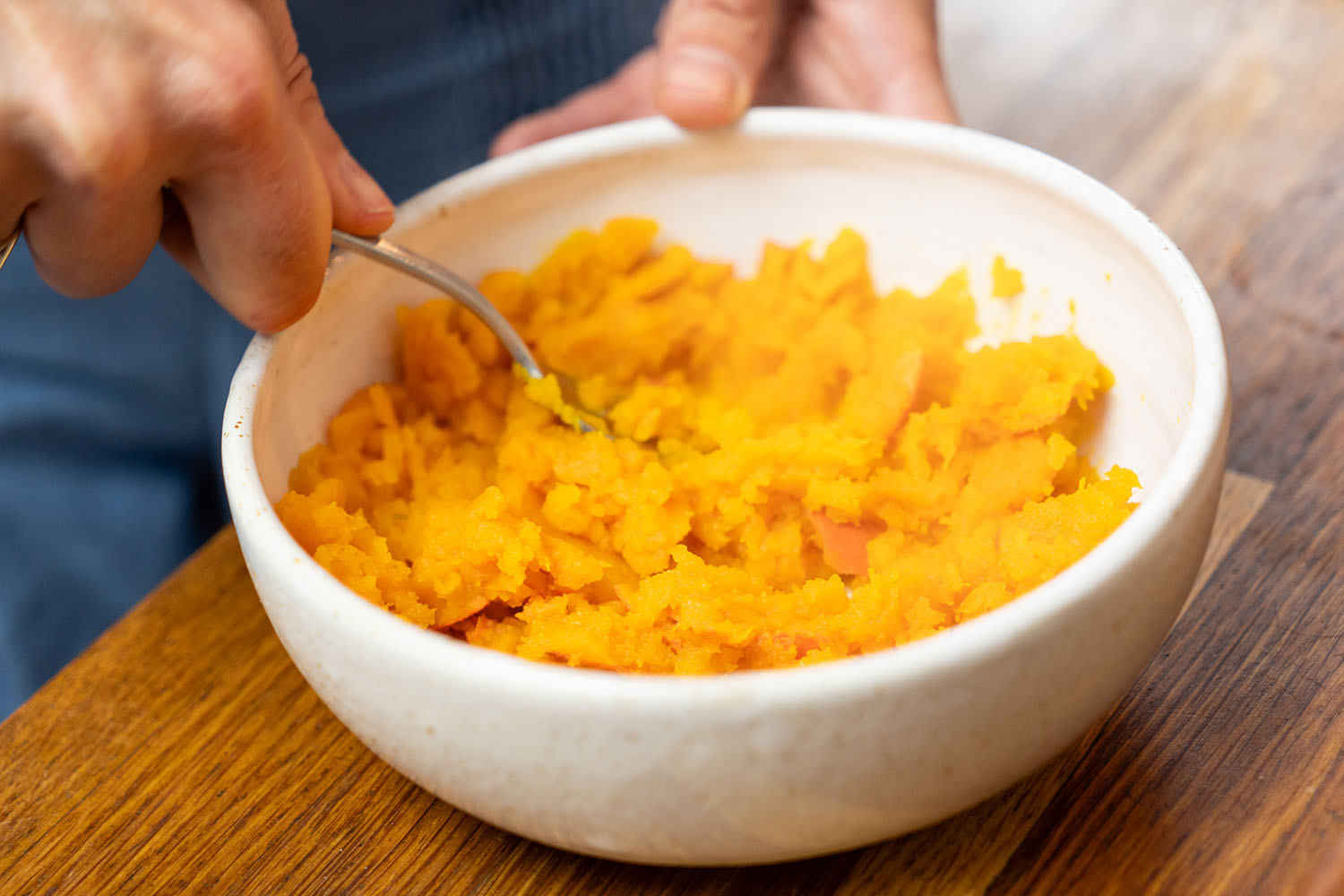 Drain the potatoes and pumpkin, mash well with a fork so that they can be easily digested, season with salt and leave to cool slightly.