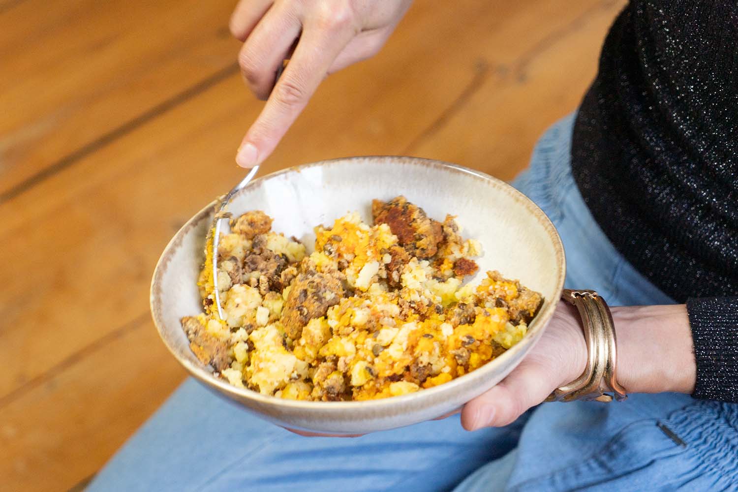 The dish is ready to be arranged: Add pumpkin puree to the bowl alongside mashed potatoes and lentil patties.