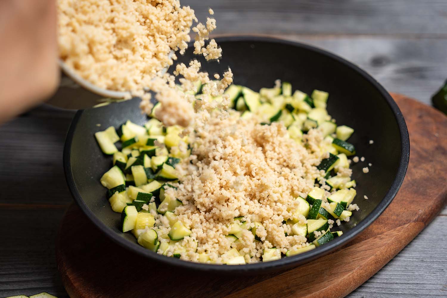 Add the couscous to the fried courgette pieces in the pan and stir. Then leave to cool.