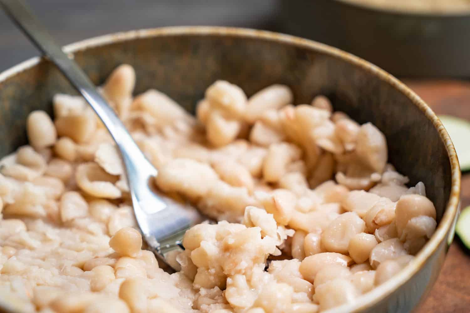 Put the white beans in a bowl and mash with a fork or "Moulinette".