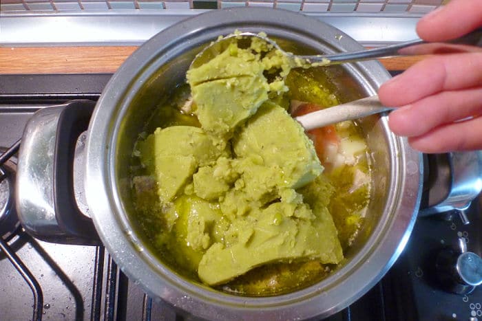 Remove the bay leaf, then add the cooked peas (for me it is puree, as the split peas fall apart during cooking).