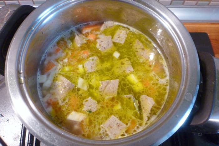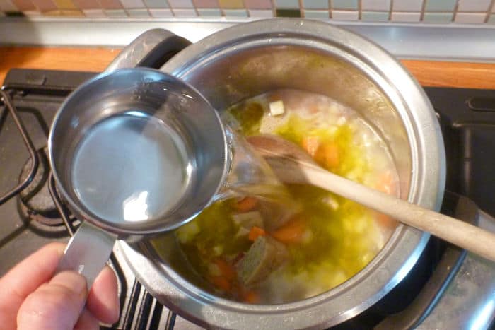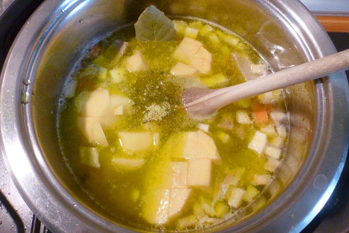 Add the water, the potatoes and the bay leaf and season with vegetable broth powder.
