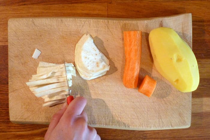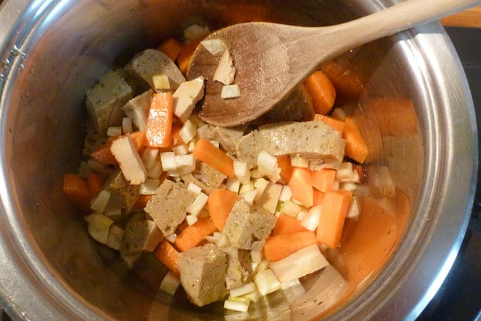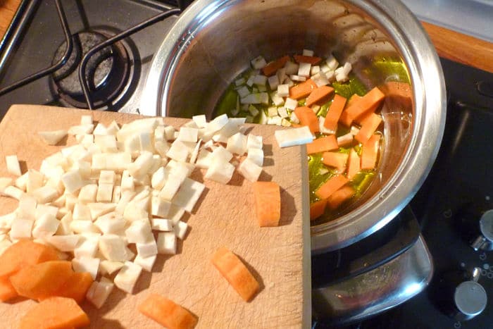 Heat the oil in a pot (not above the smoke point) and fry the carrot and celery for about 3 minutes.
