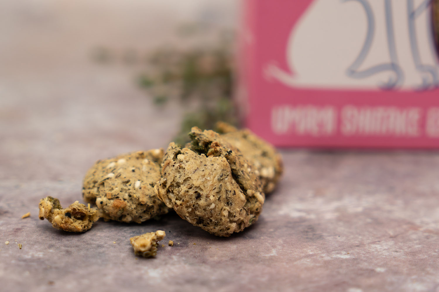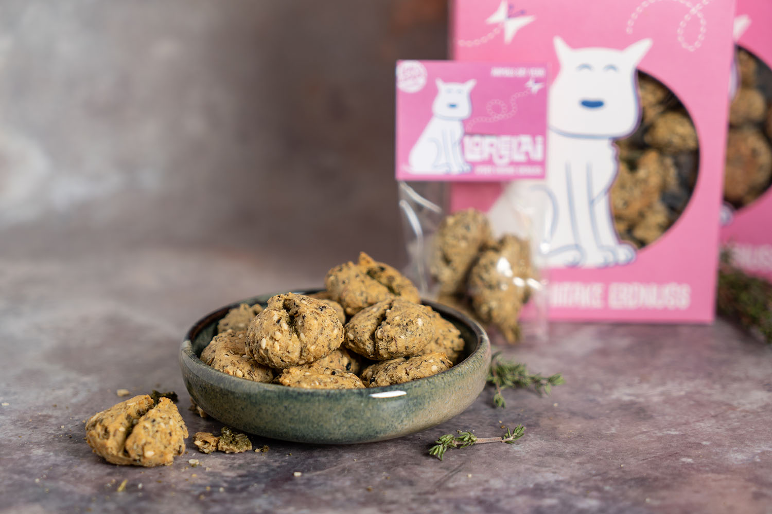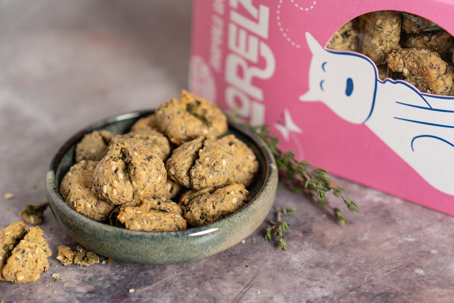 Meine tiefe Freundschaft mit Eddie hat mich zu Lorelai inspiriert. Ich verstecke für die kleine Schnüffelnase die Knusperkekse, kuller sie ihm zu, oder er snackt sie mir direkt aus der Hand. Eddie läuft das Wasser im Maul zusammen beim herzhaften Geschmack von Shiitake und Erdnuss verfeinert mit den duftenden Kräutern Thymian und Rosmarin.