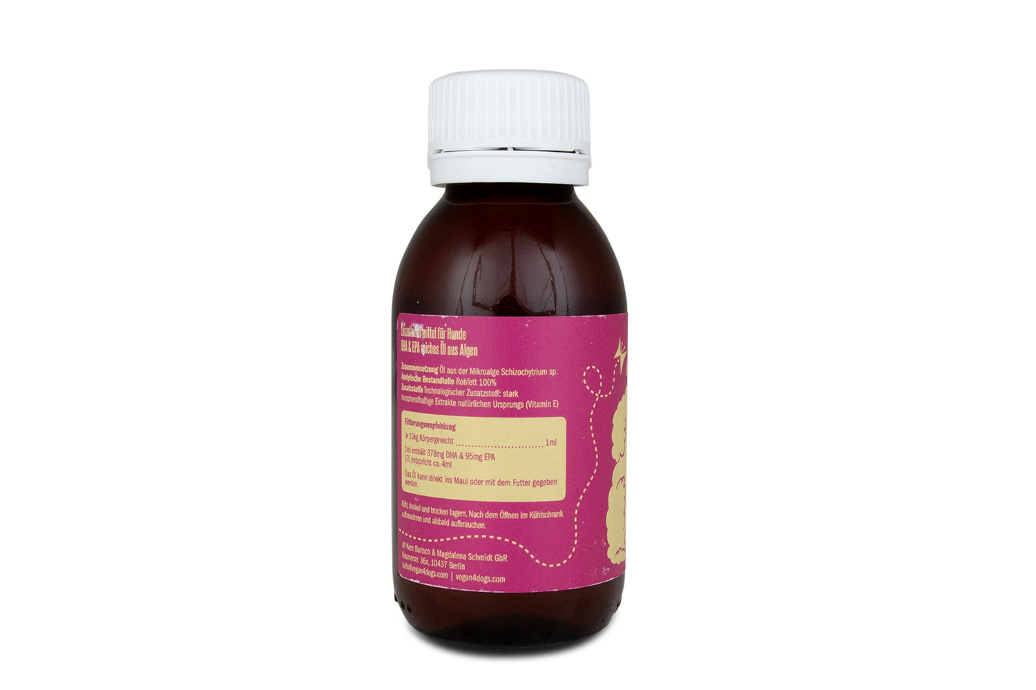 Der Bedarf an EPA und DHA kann je nach Alter, Aktivität und eventuell vorliegendem Krankheitsbild des Hundes variieren. Unsere Curly ist ein hochkonzentriertes Algenöl mit ca. 378mg DHA und 95mg EPA pro 1ml.