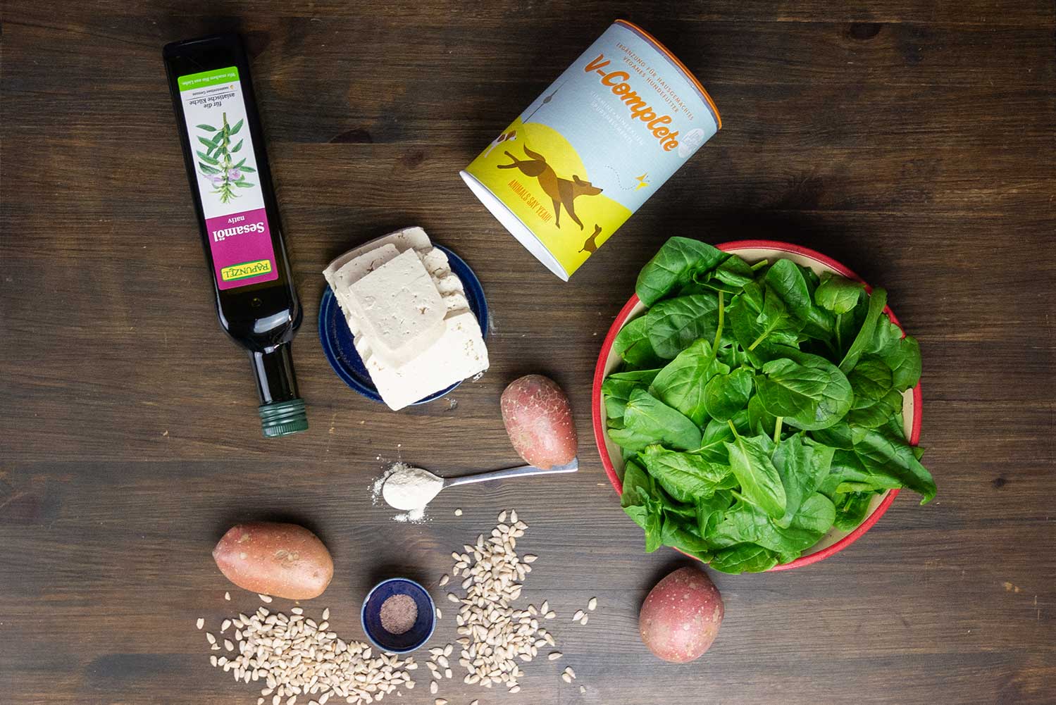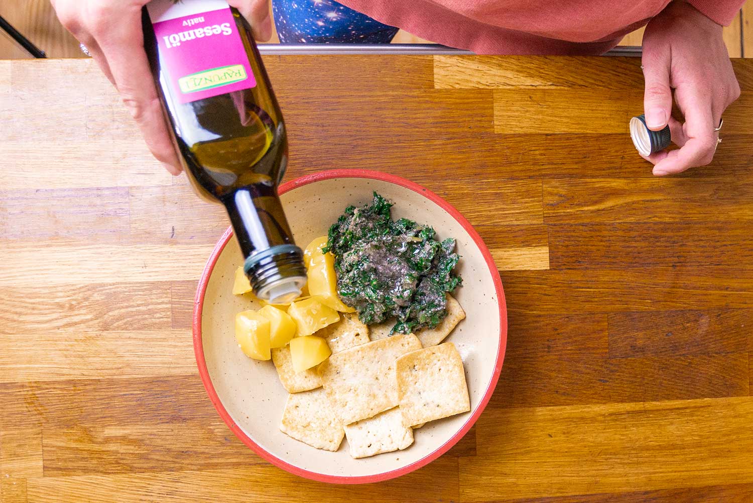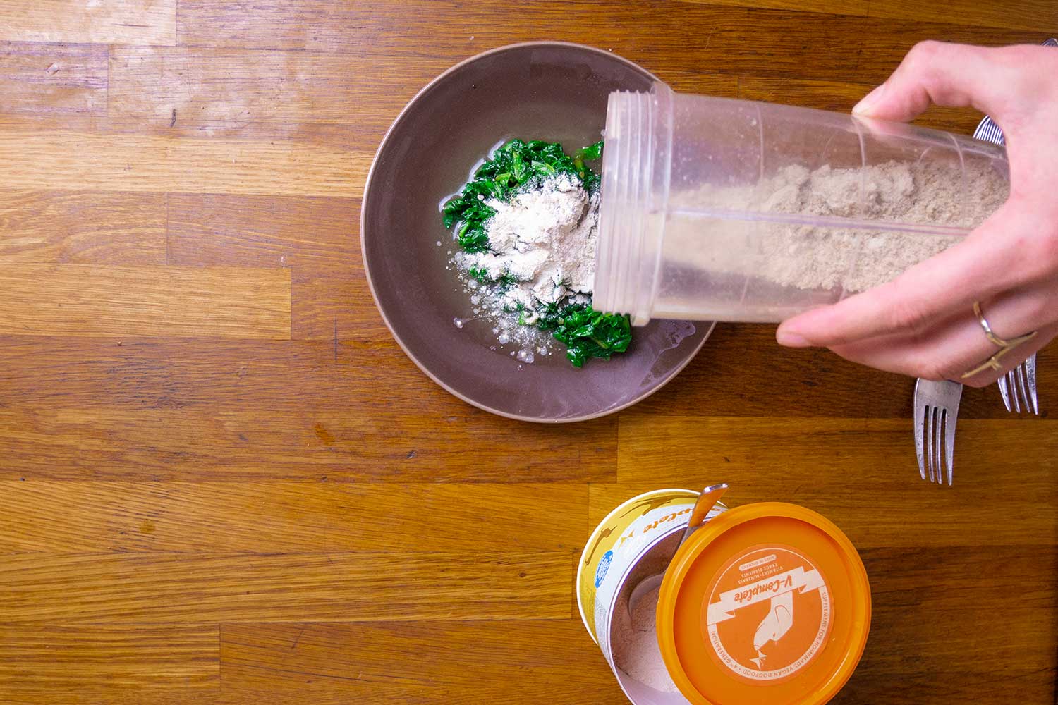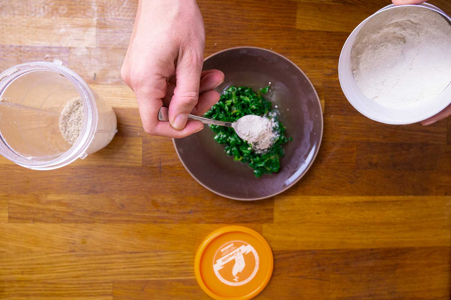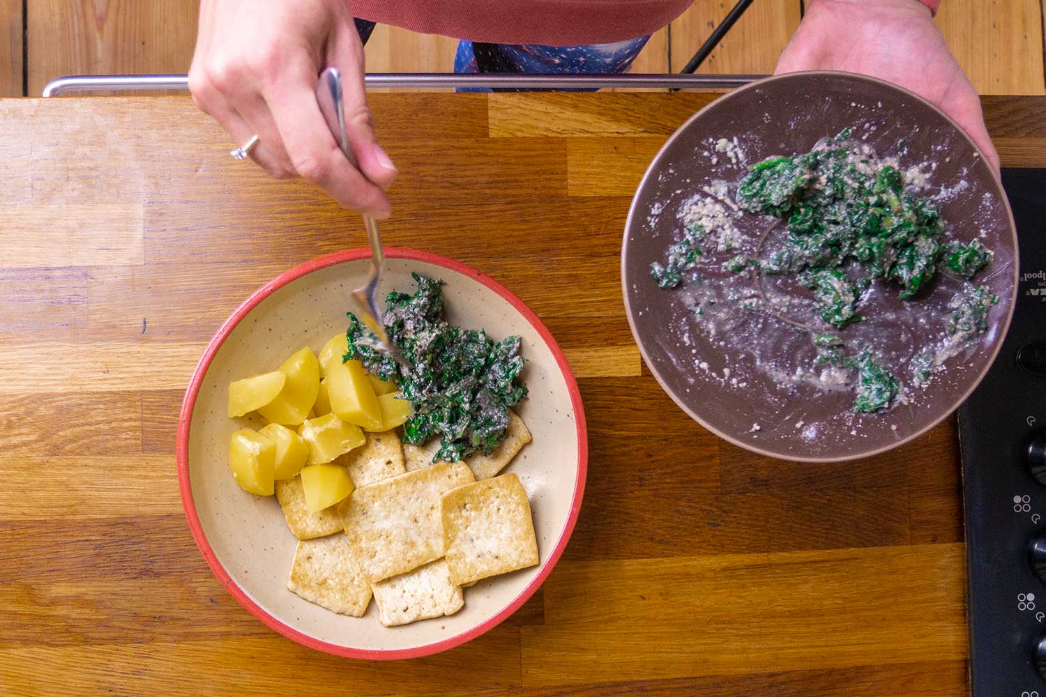 Den Spinat mit wenig Wasser in der Pfanne garen. Diesen ebenfalls abkühlen und dann fein hacken. Mit V-Complete und den Sonnenblumenkernen vermischen und den Kartoffeln und den Tofuscheiben im Napf arrangieren.