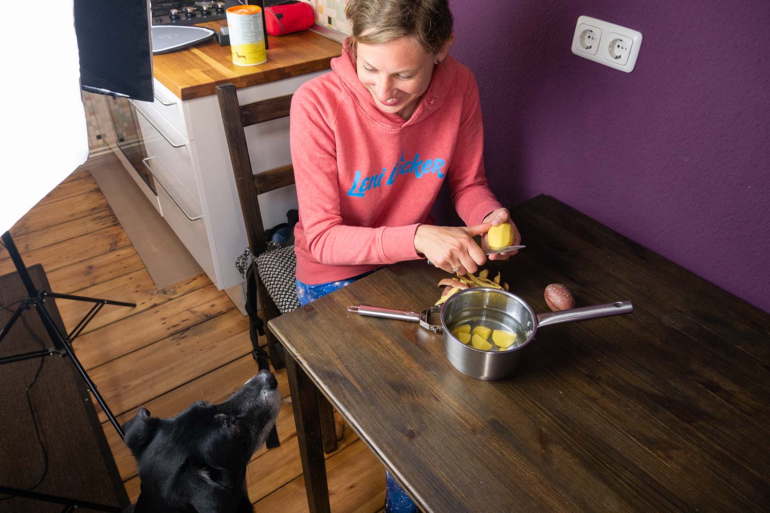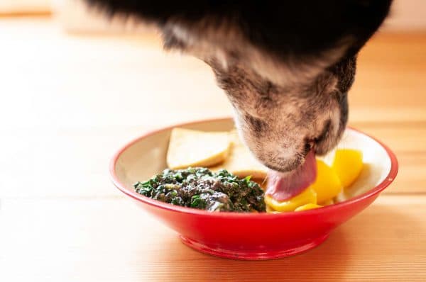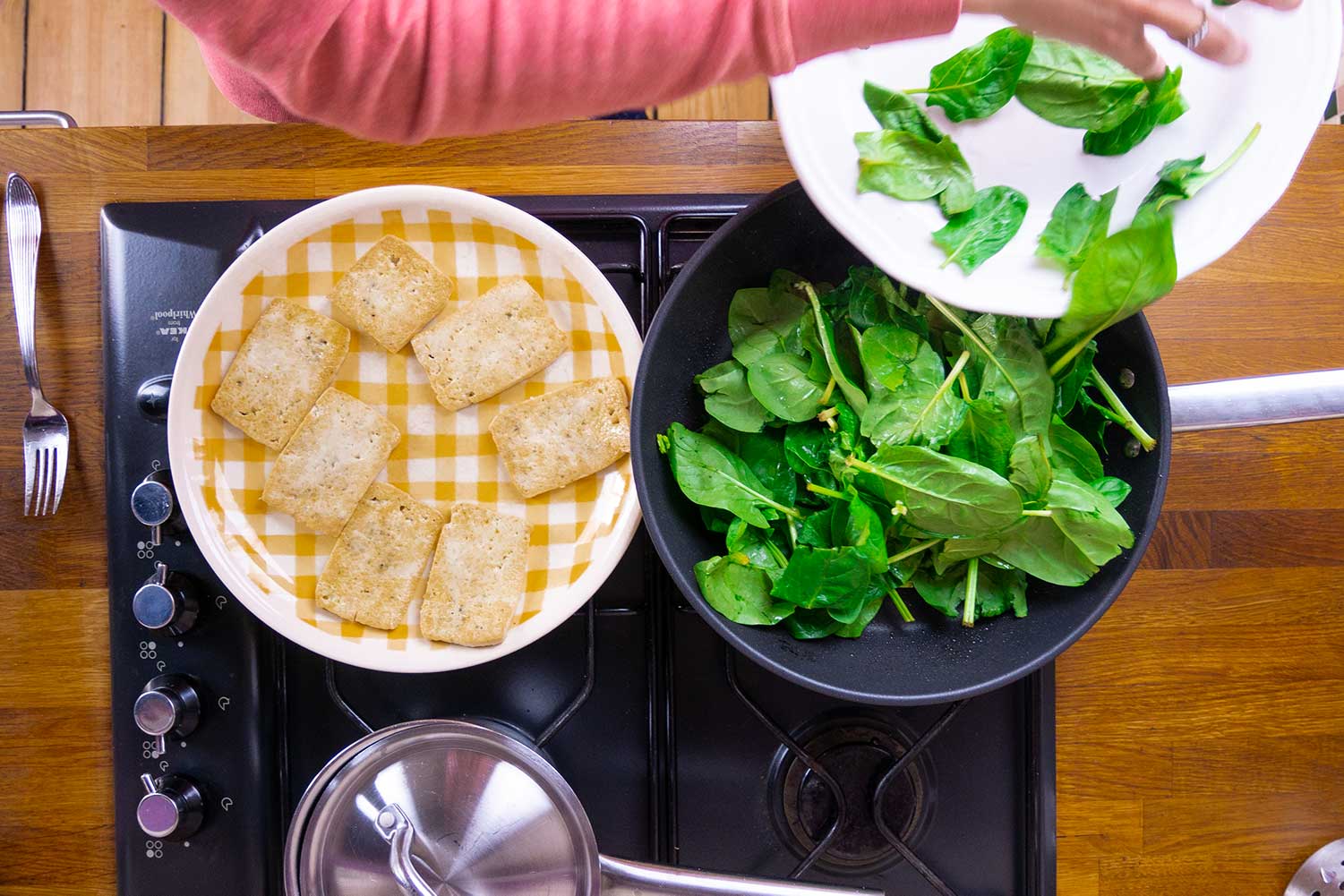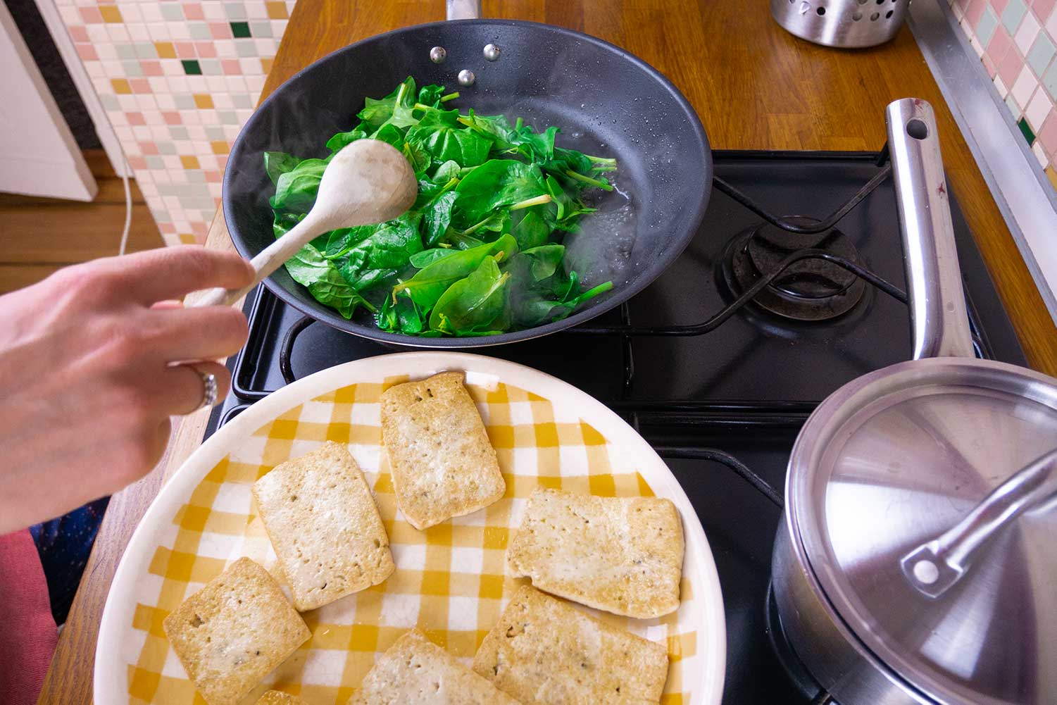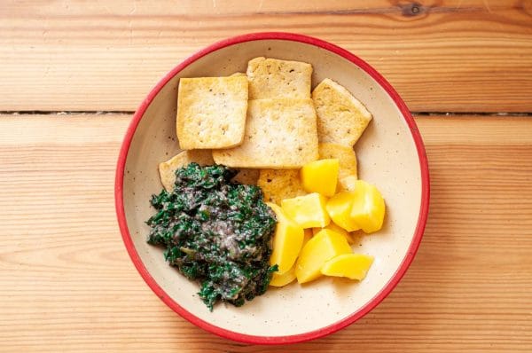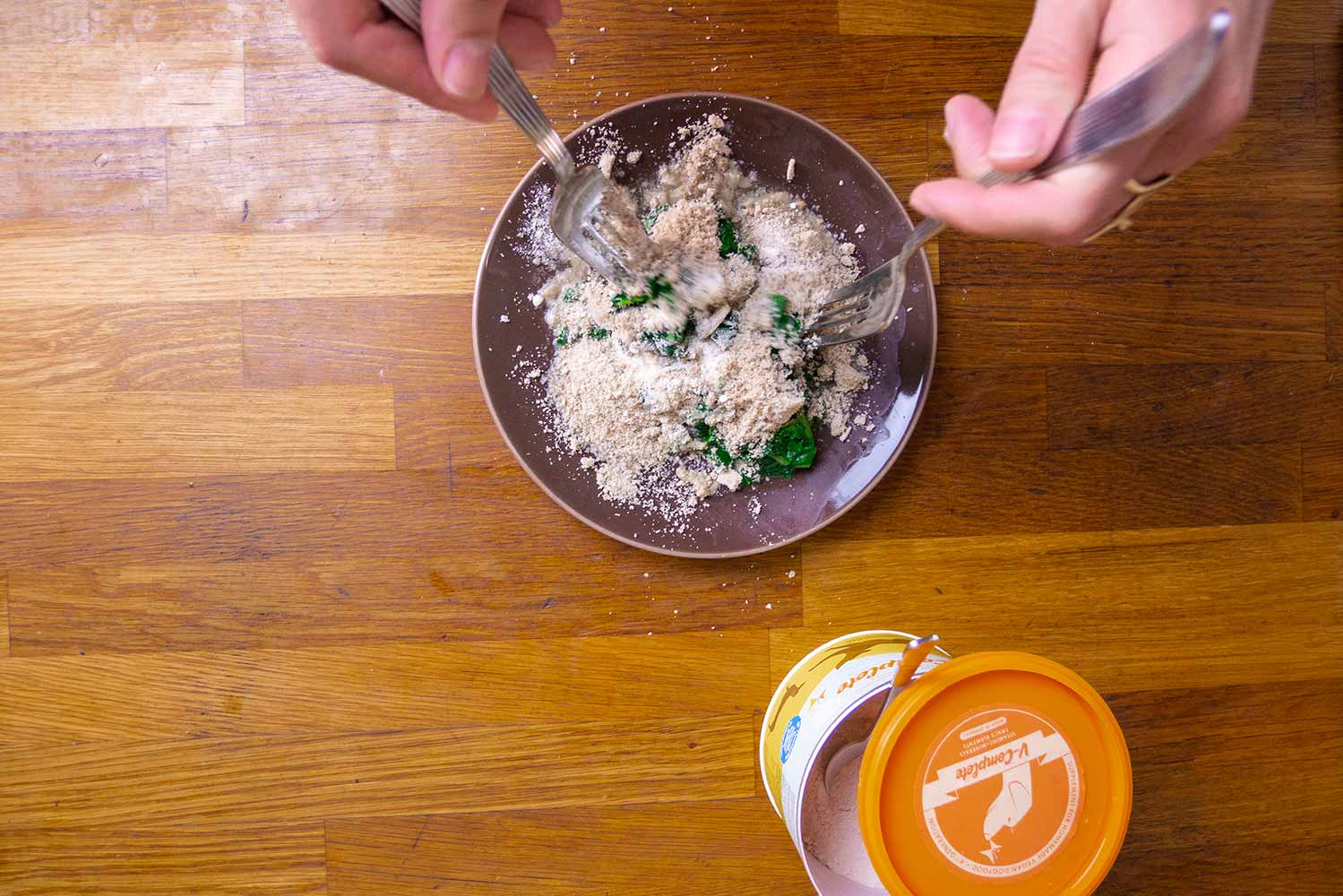 Den Spinat mit wenig Wasser in der Pfanne garen. Diesen ebenfalls abkühlen und dann fein hacken. Mit V-Complete und den Sonnenblumenkernen vermischen und den Kartoffeln und den Tofuscheiben im Napf arrangieren.