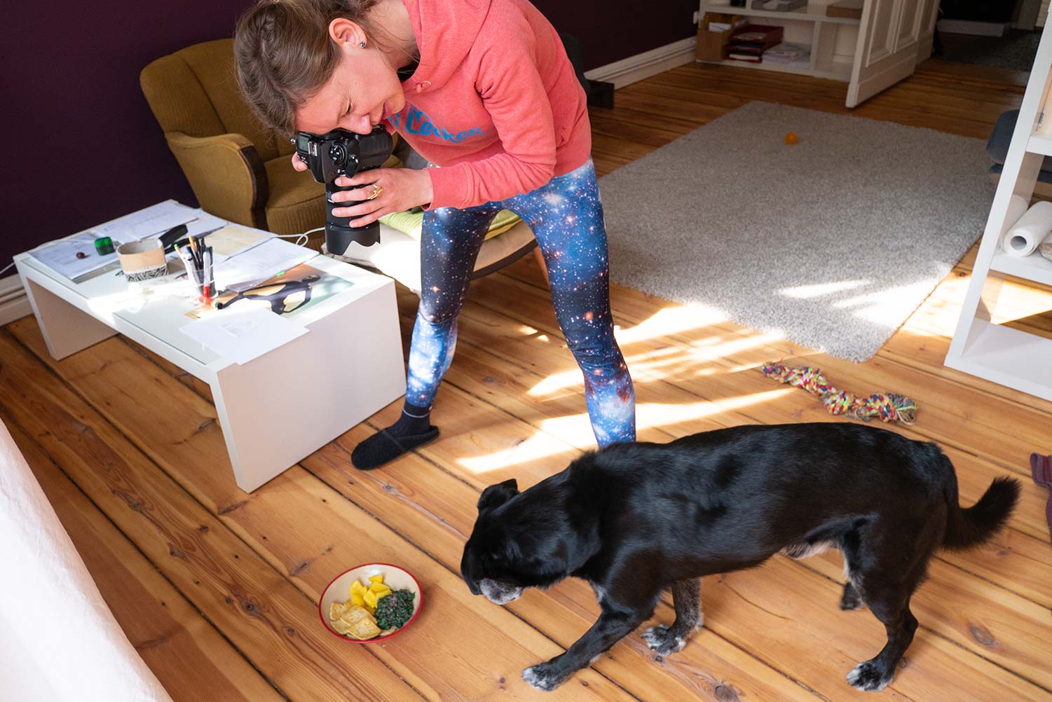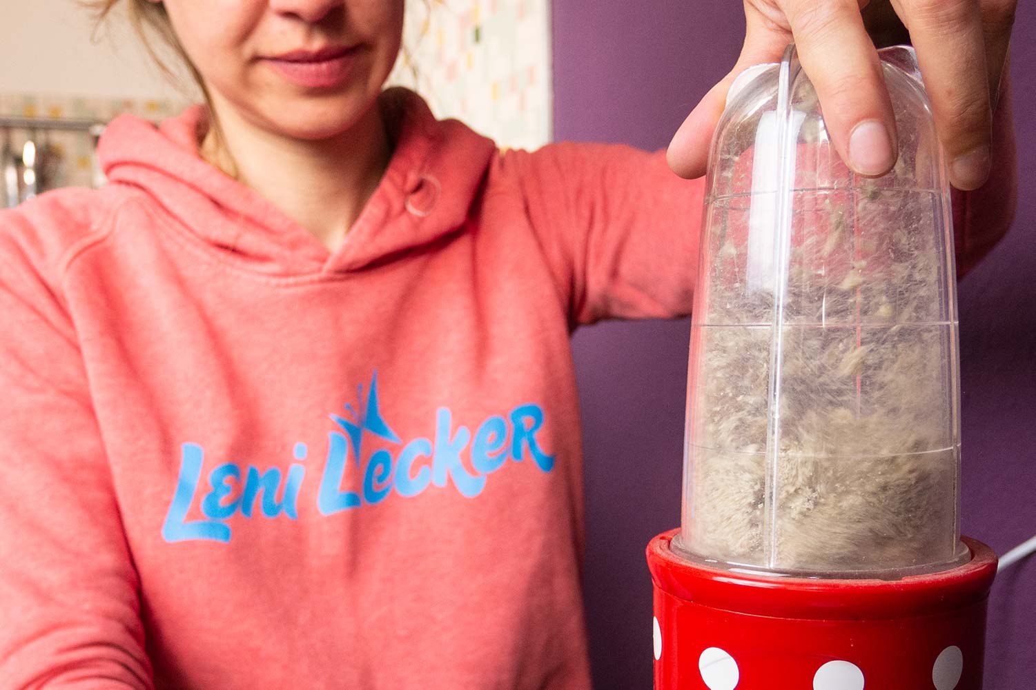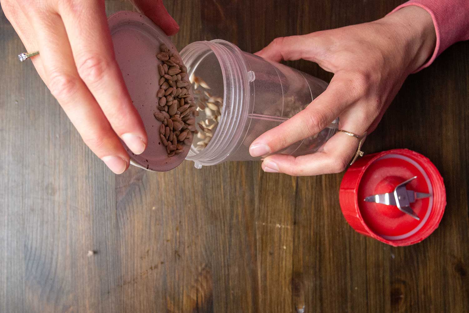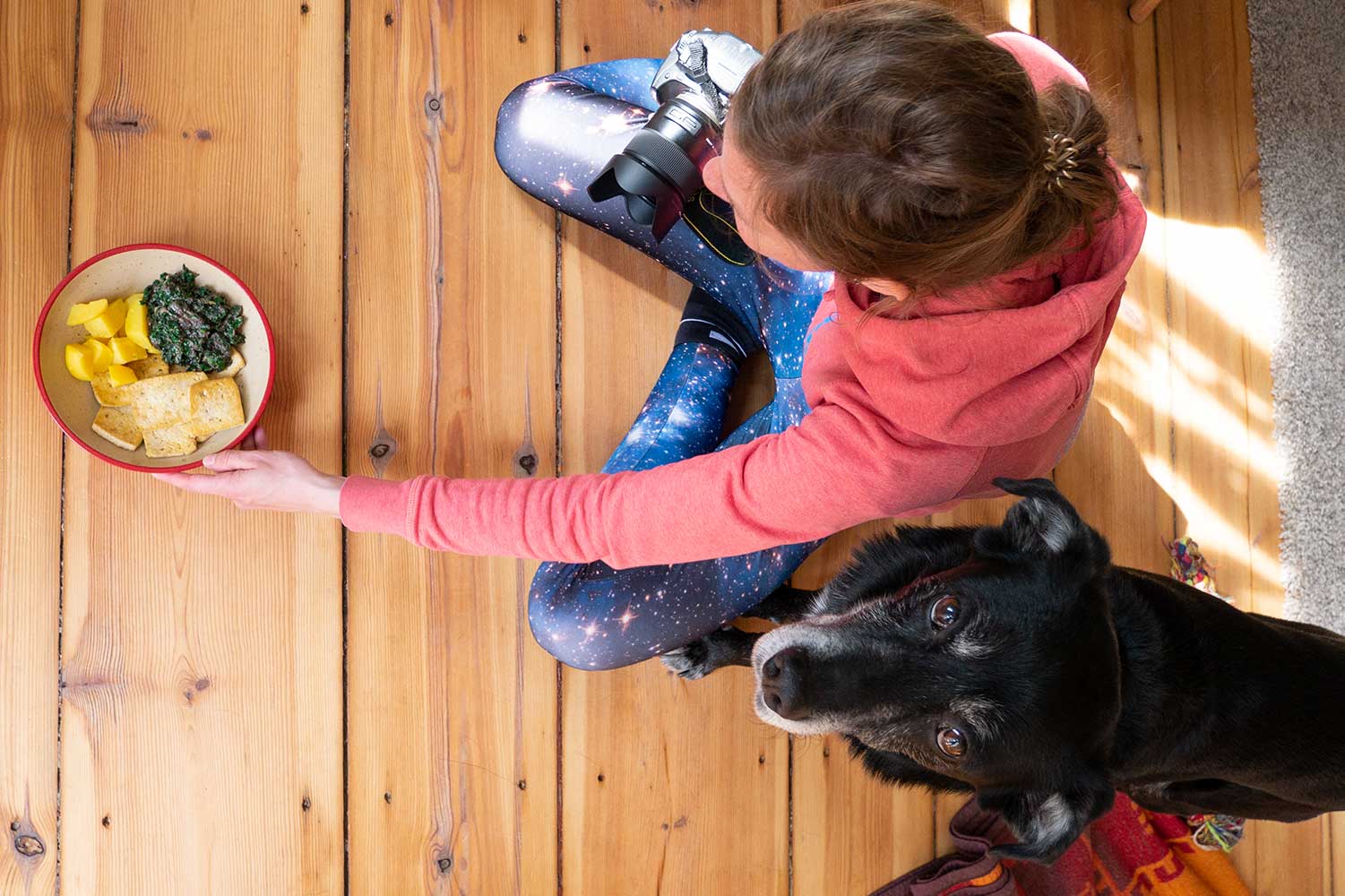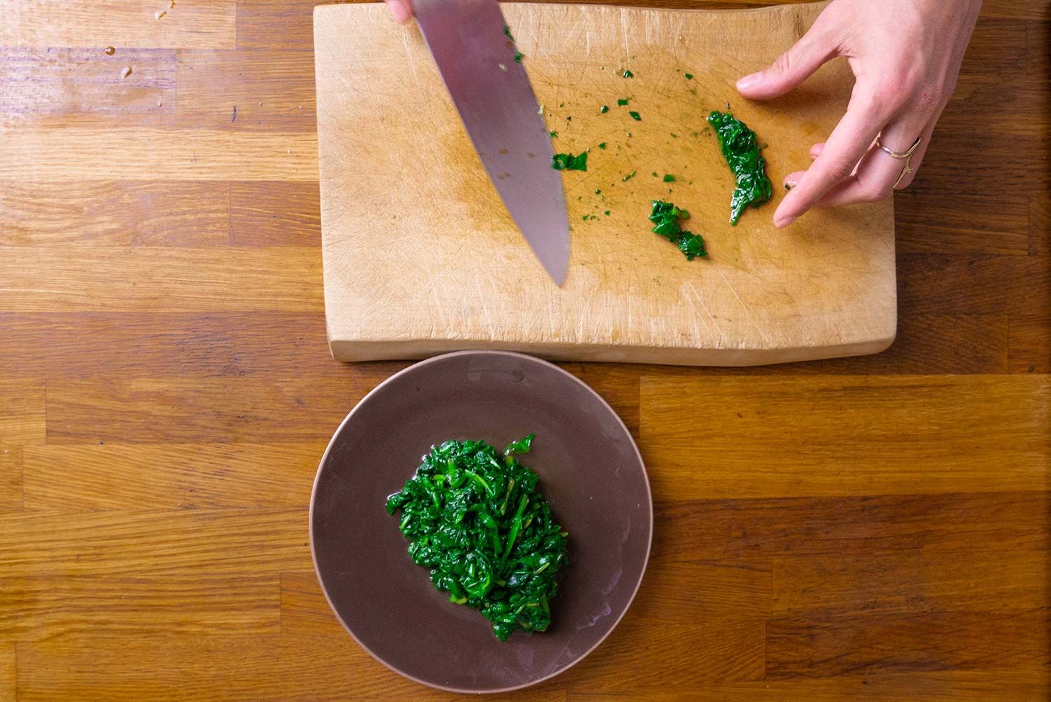 Den Spinat mit wenig Wasser in der Pfanne garen. Diesen ebenfalls abkühlen und dann fein hacken. Mit V-Complete und den Sonnenblumenkernen vermischen und den Kartoffeln und den Tofuscheiben im Napf arrangieren.