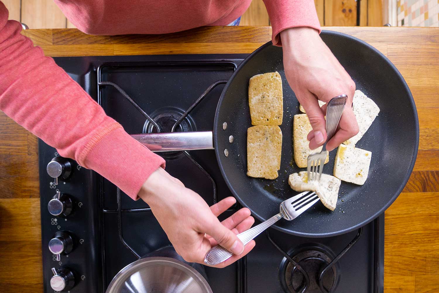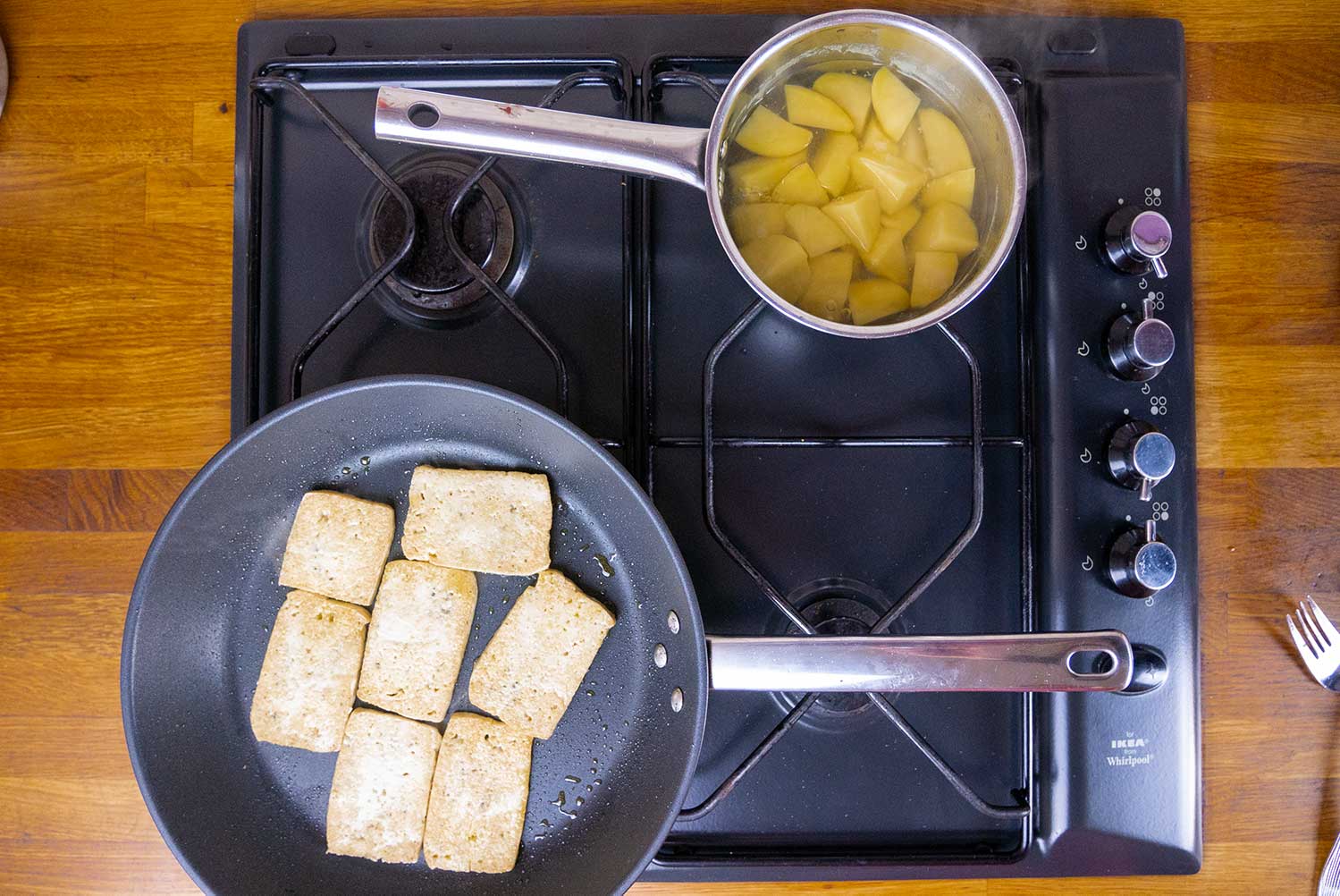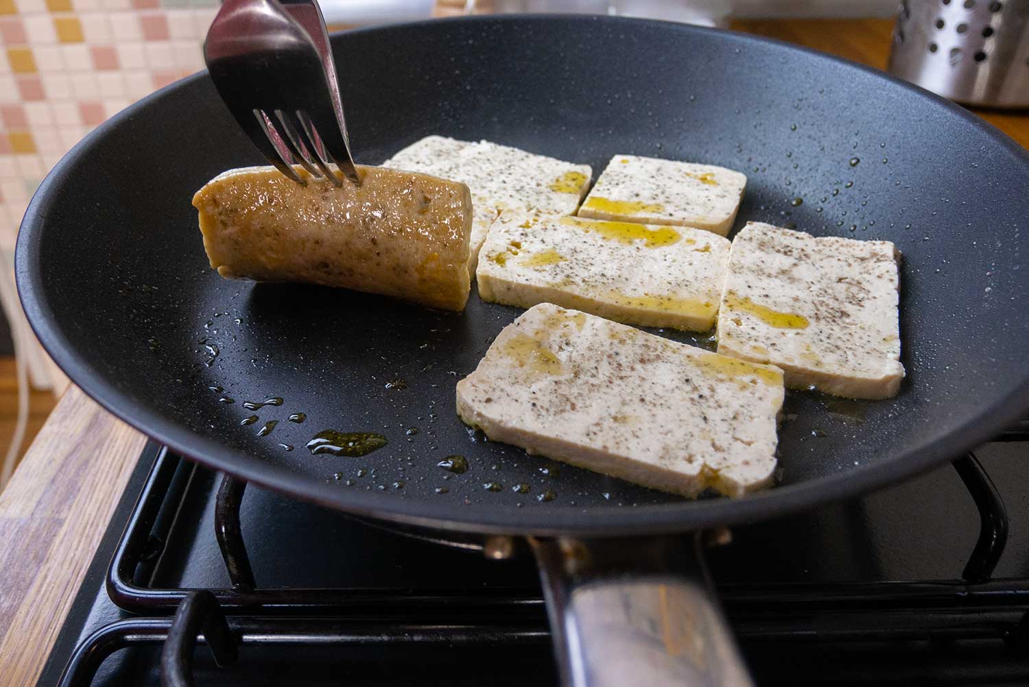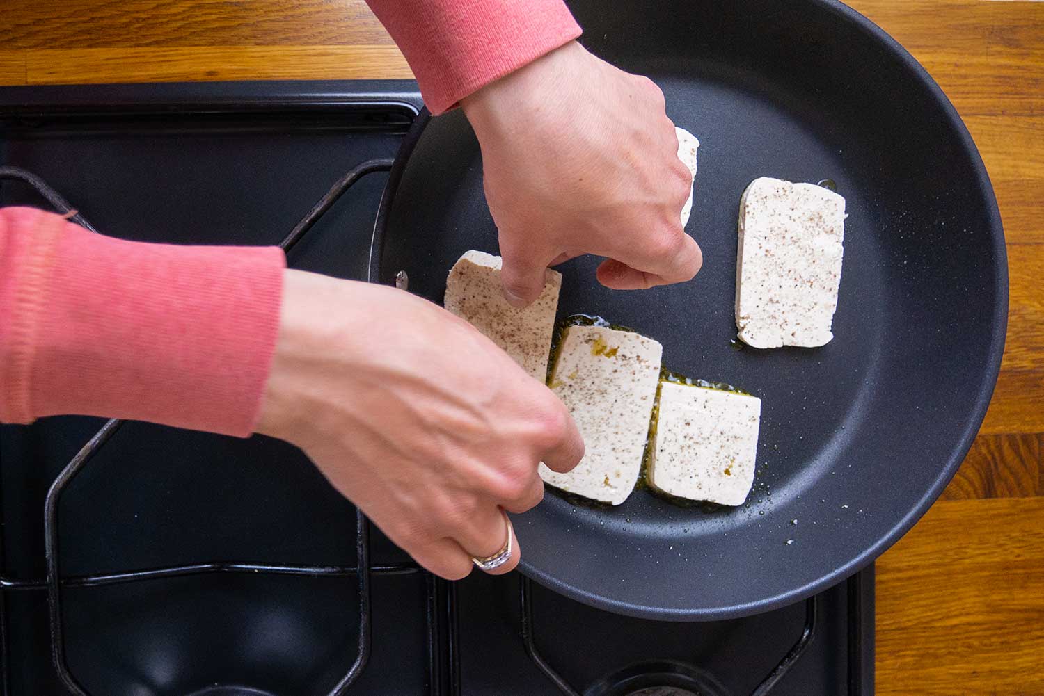 Nun werden die Tofu Scheiben mit etwas Rapsöl in der Pfanne von beiden Seiten goldbraun gebraten und anschließend auf einem Teller abgekühlt.