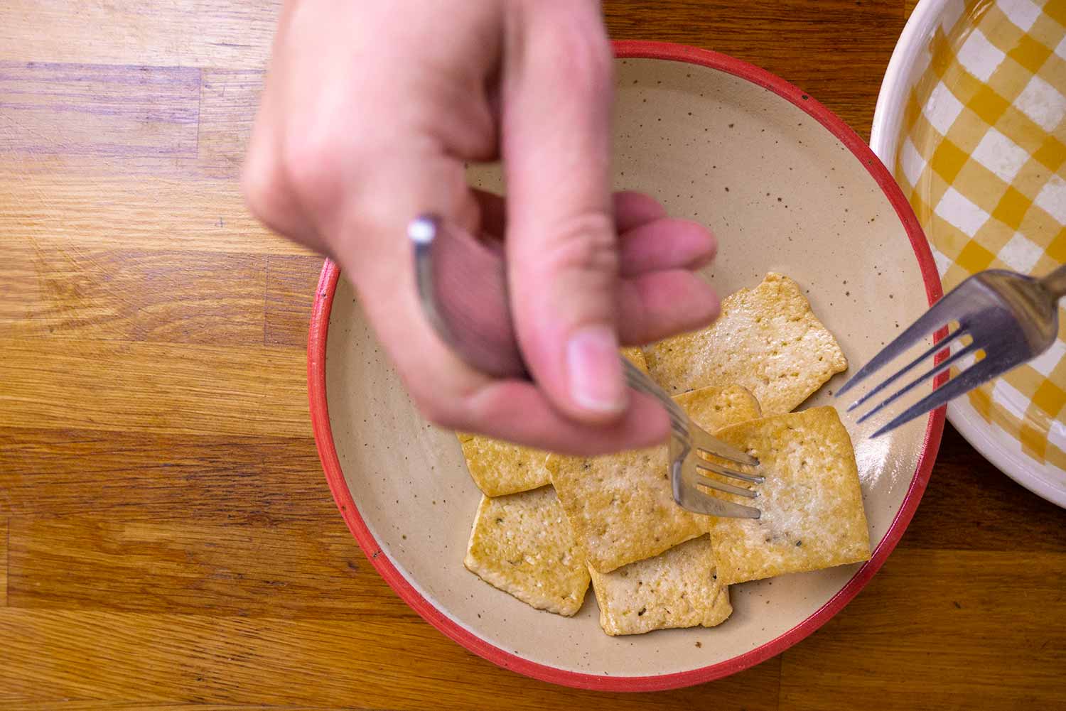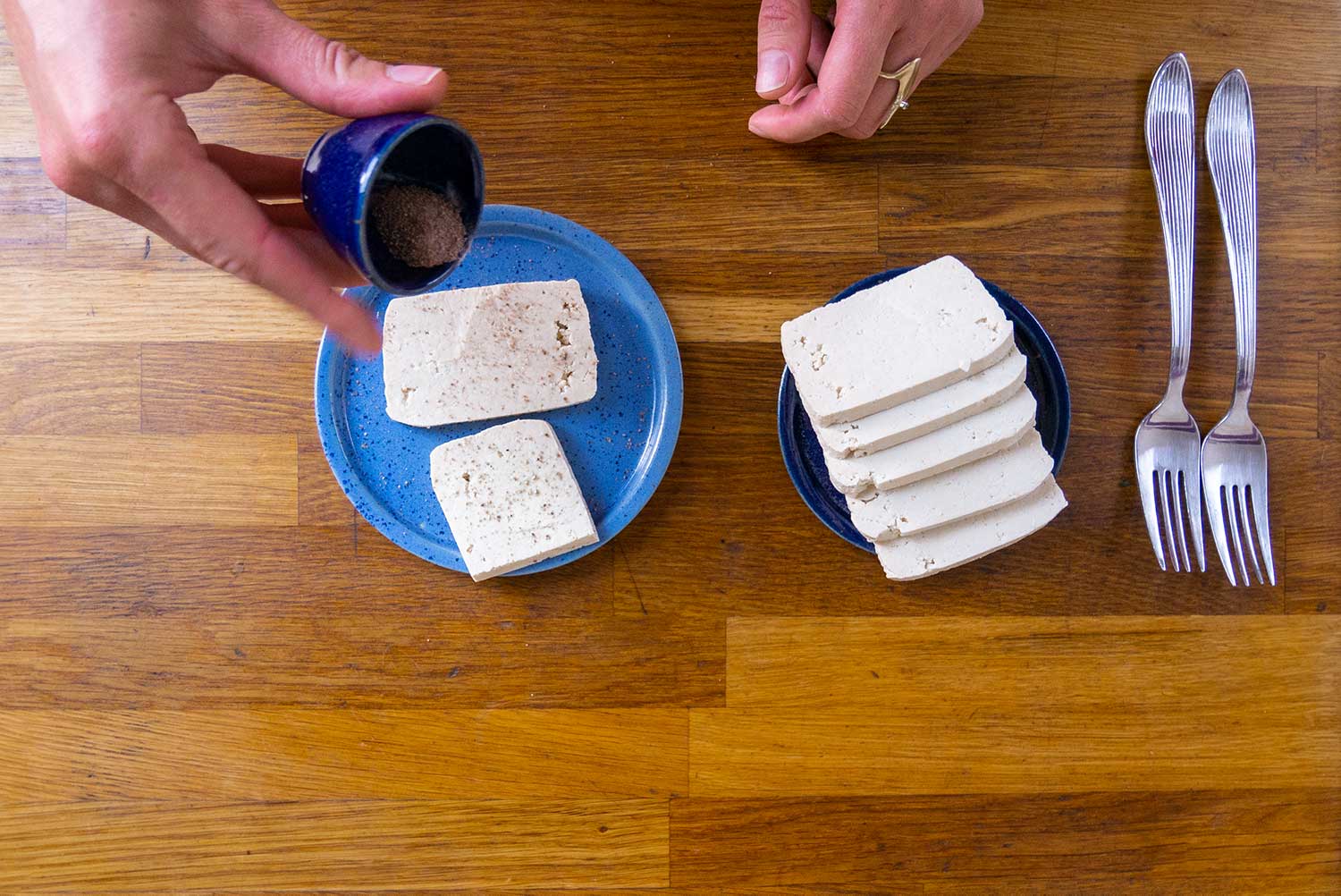Den Tofu in dünne Scheiben schneiden und beidseitig mit dem Kala Namak bestreuen. Kala Namak ist ein Salz das geringe Mengen an Schwefelverbindungen enthält und dem Tofu einen eiähnlichen Geschmack und Geruch verleiht.