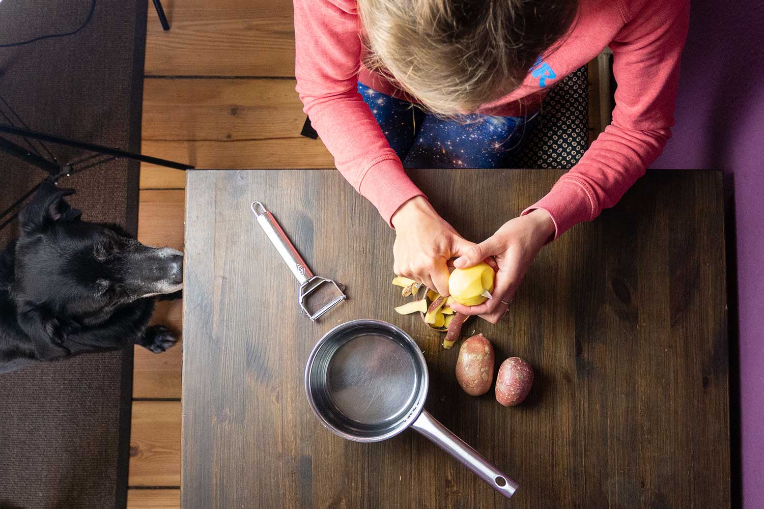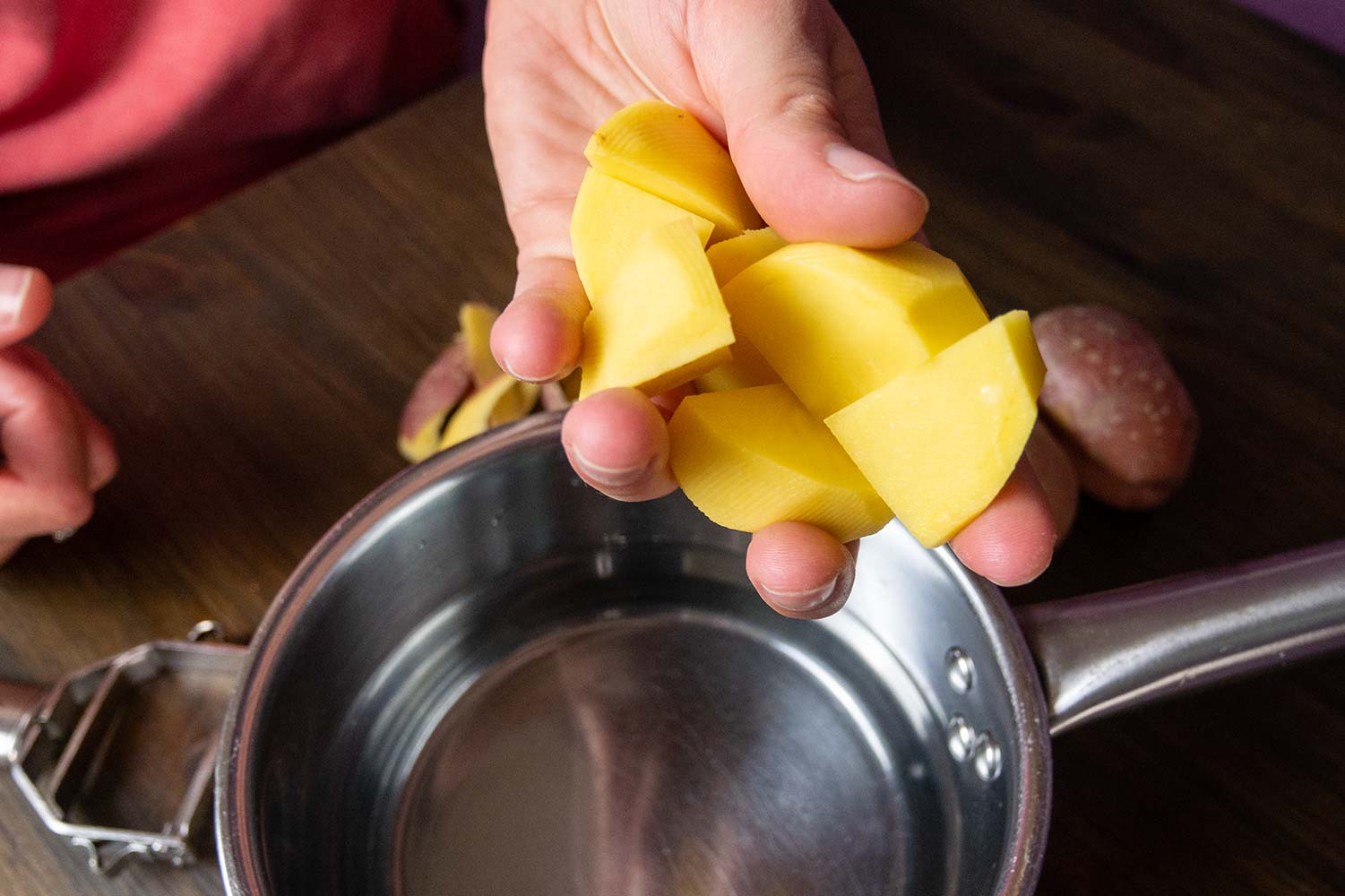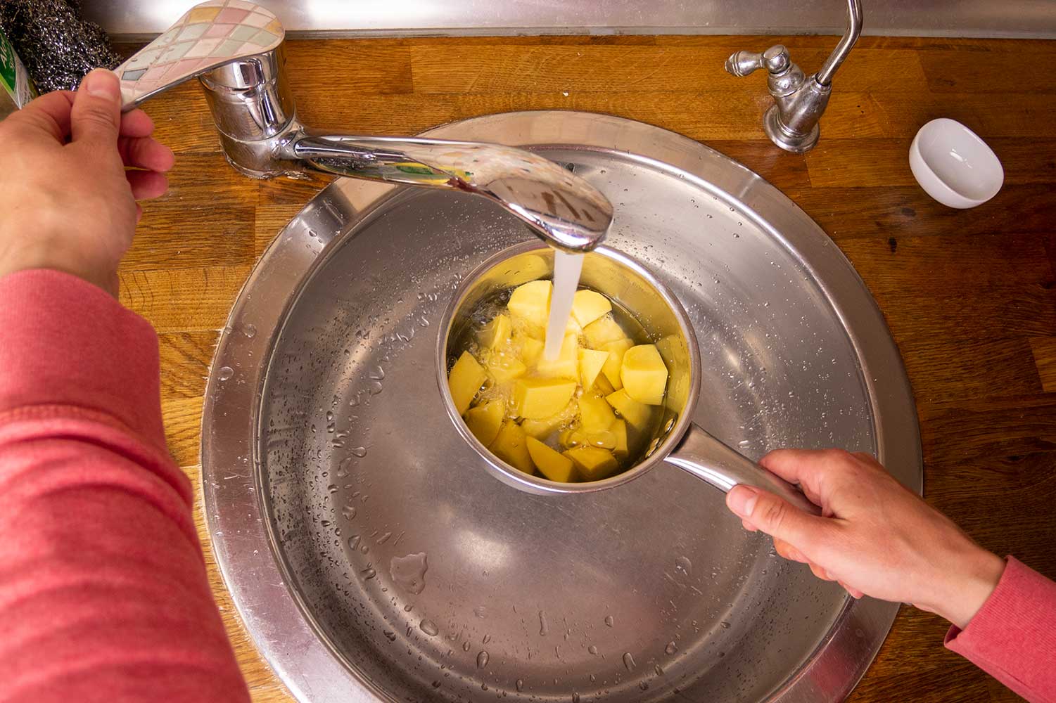 Zuerst werden die Kartoffeln geschält und in etwas leicht gesalzenem Wasser gegart.
