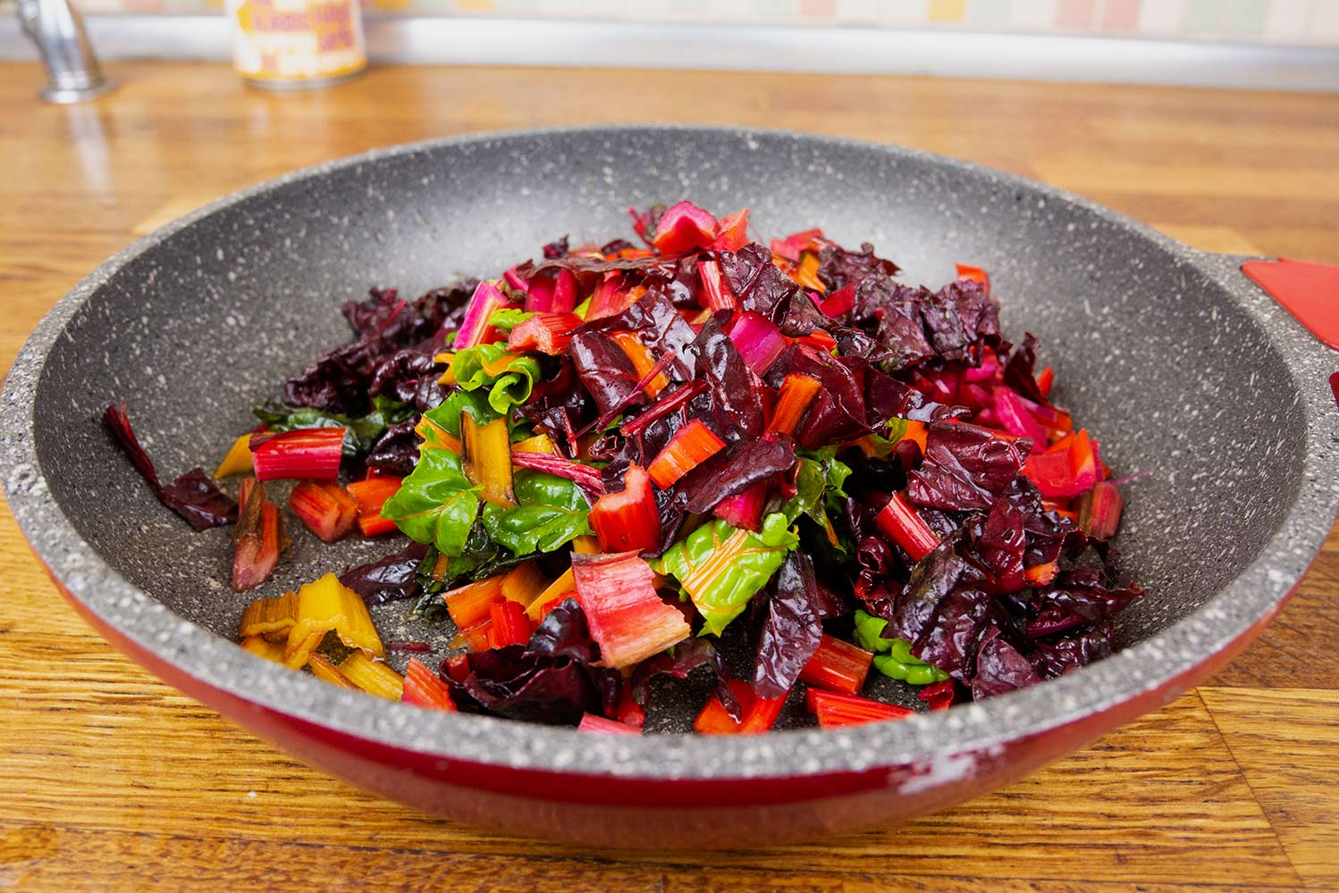 Den Mangold waschen, in kleine Stücke schneiden und in wenig Wasser mit Deckel einige Minuten garen.