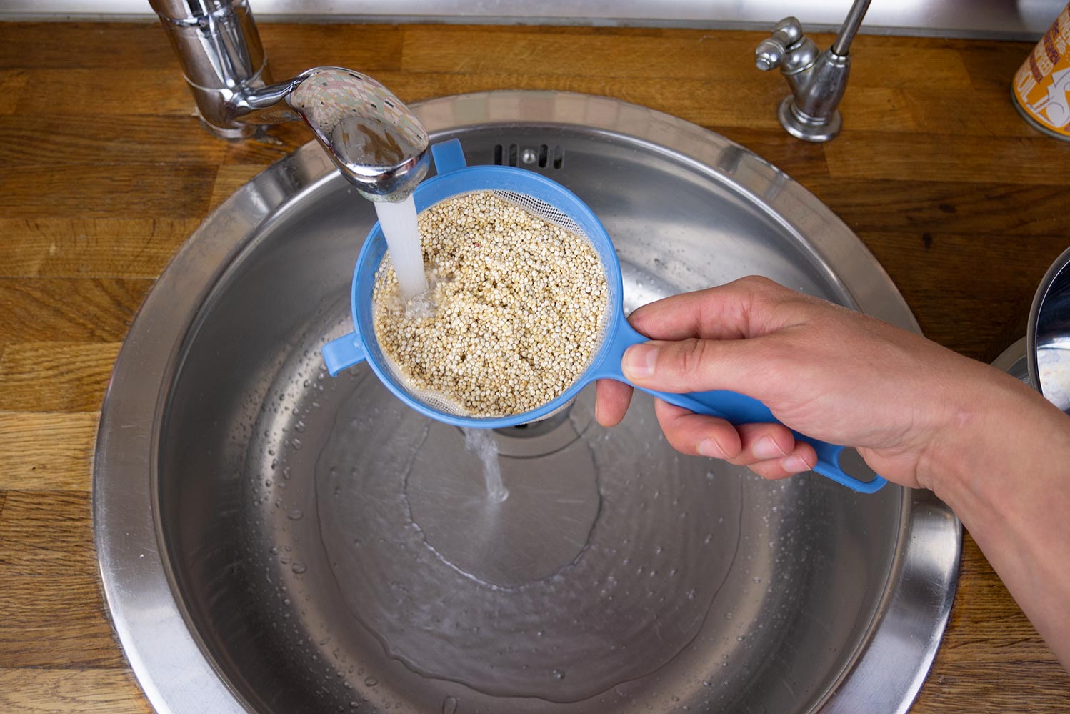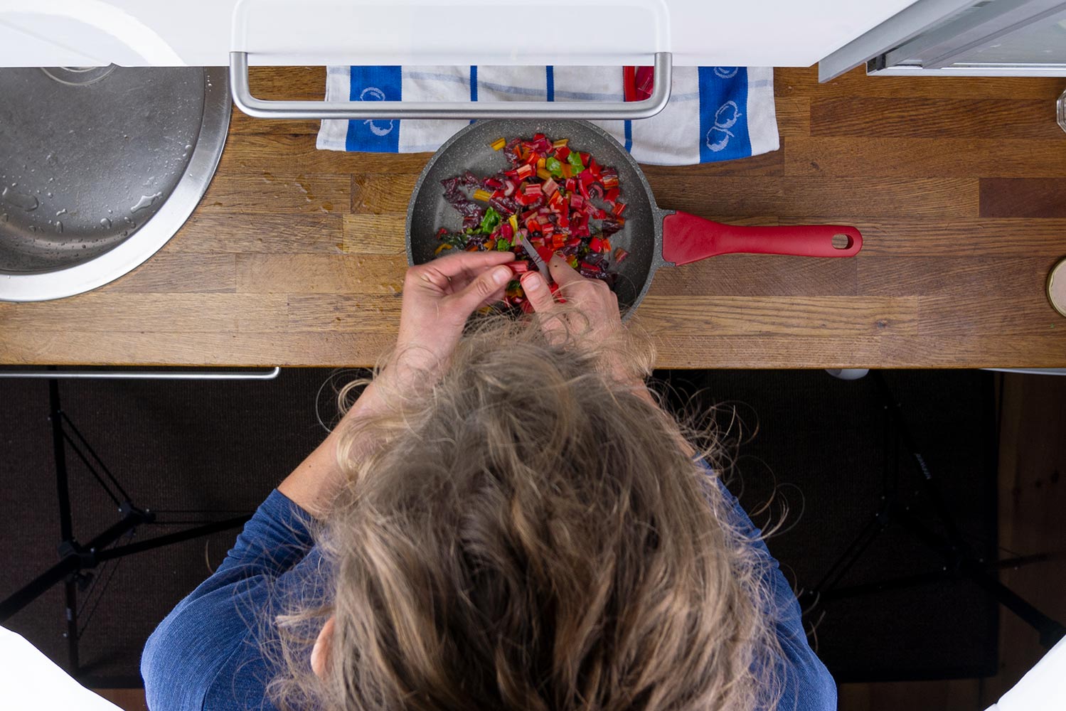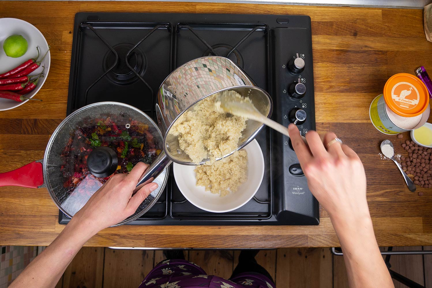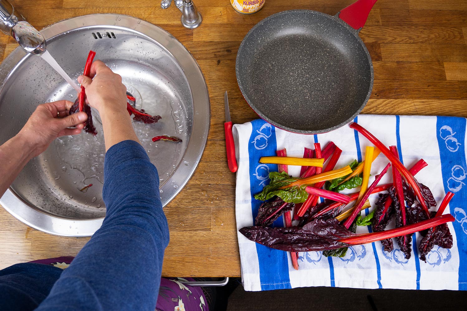 Zuerst wird die Quinoa gewaschen und in der doppelten Menge Wasser und einer kleinen Menge Salz gekocht. Als Gemüse haben wir uns für Mangold entschieden. Die herrlichen Farben erinnern mich total an den Herbst, in dessen Saison er wächst. Das Gemüse kannst du auch je nach Saison variieren.