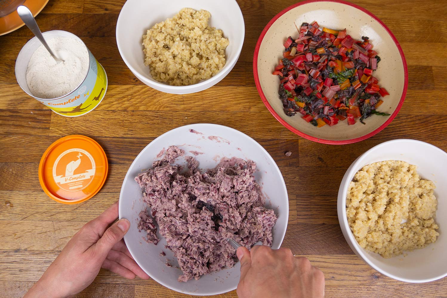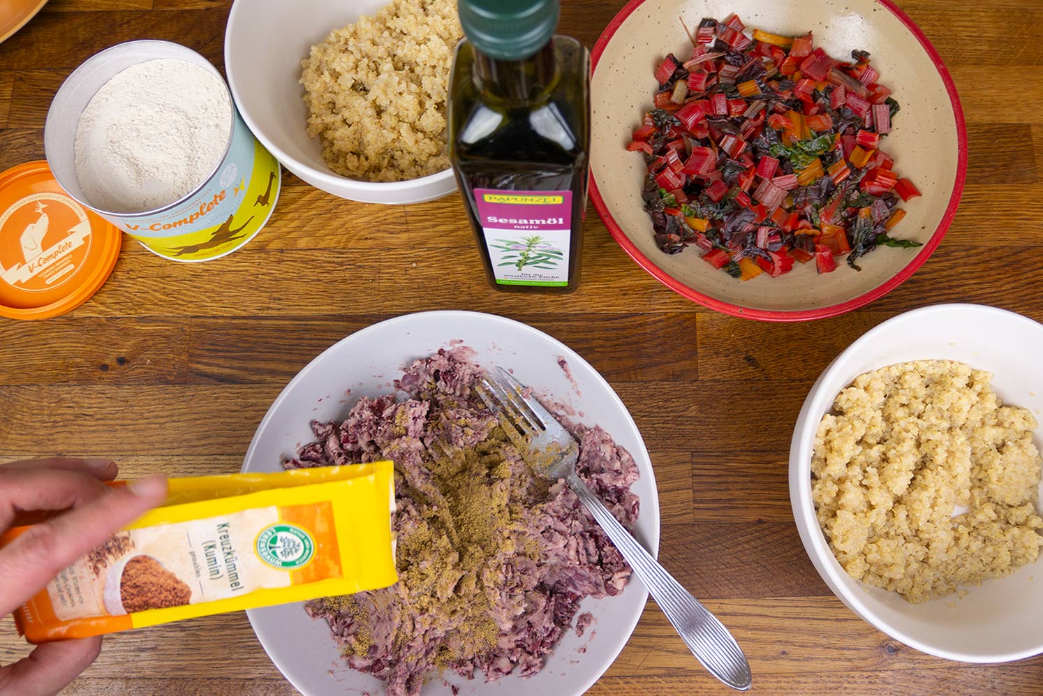 V-Complete, Öl und etwas Kreuzkümmel hinzufügen.