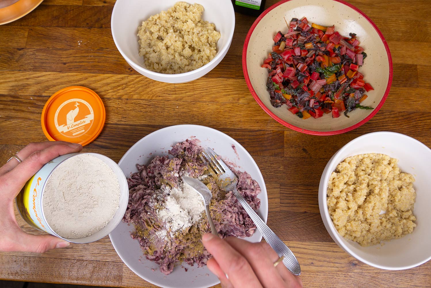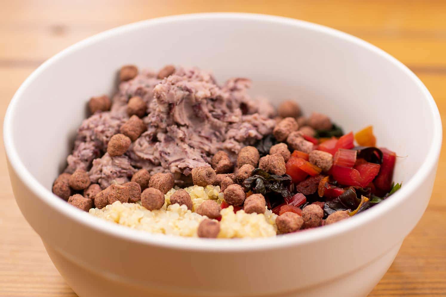 Mangold, Quinoa, und die Kidneybohnen in einen Napf geben und mischen. Zum Schluss noch Greta drüber streuen. Fertig. Guten Appetit.