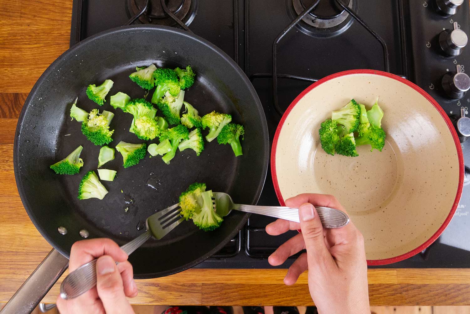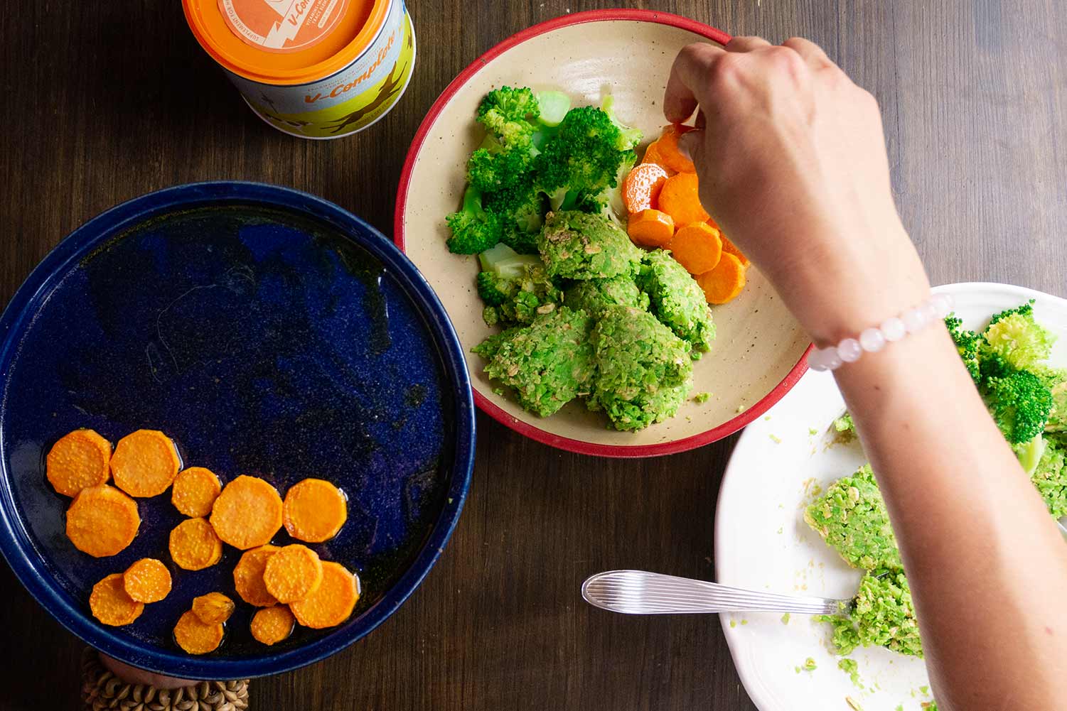 Mit den Broccoliröschen und den Süßkartoffelscheibchen anrichten und servieren.