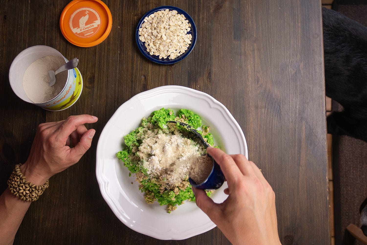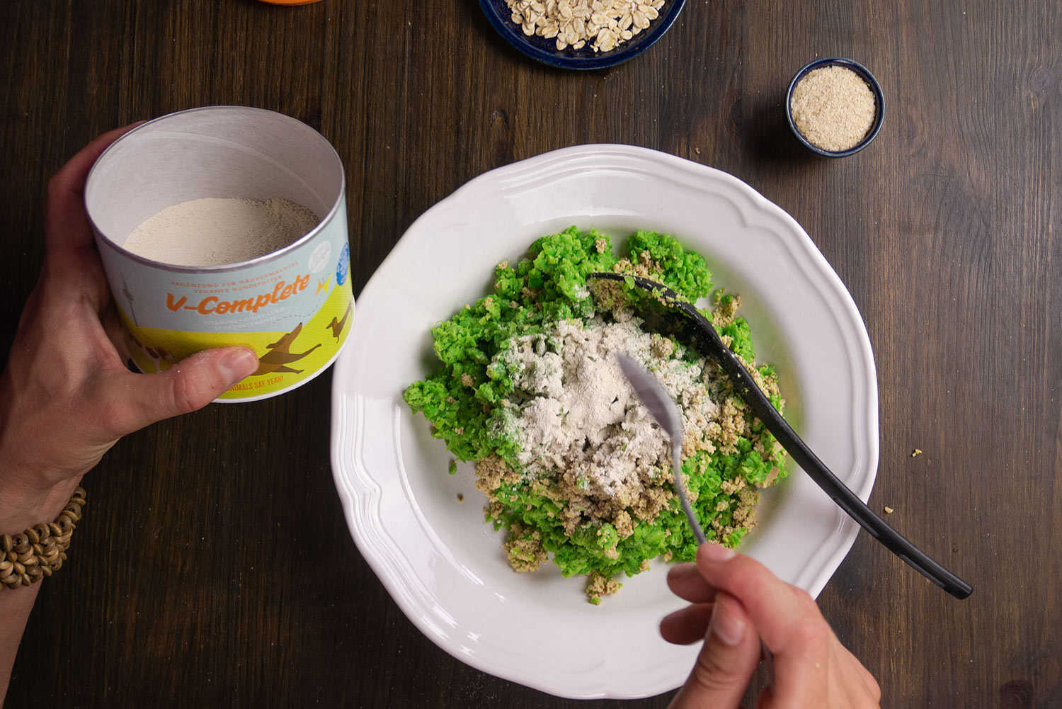 Hefeflocken, Haferflocken, Salz und V-Complete hinzufügen, alles gut vermengen und mit zwei Löffeln kleine Pralinen formen.