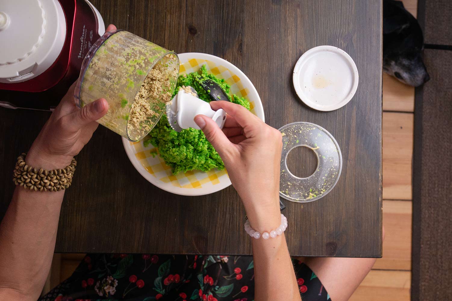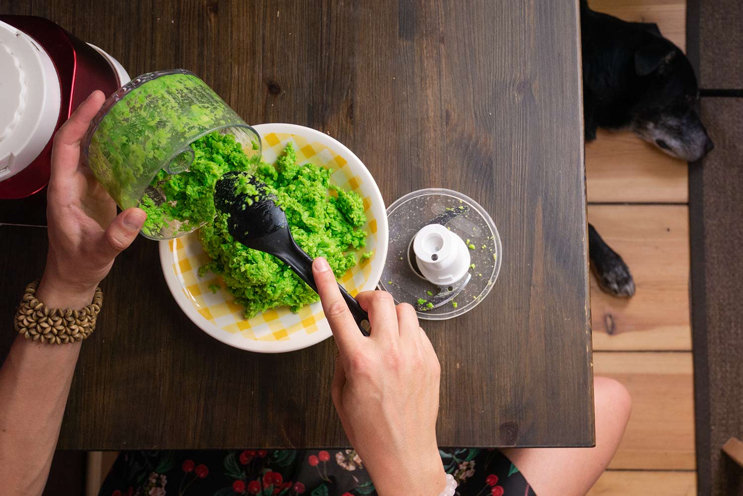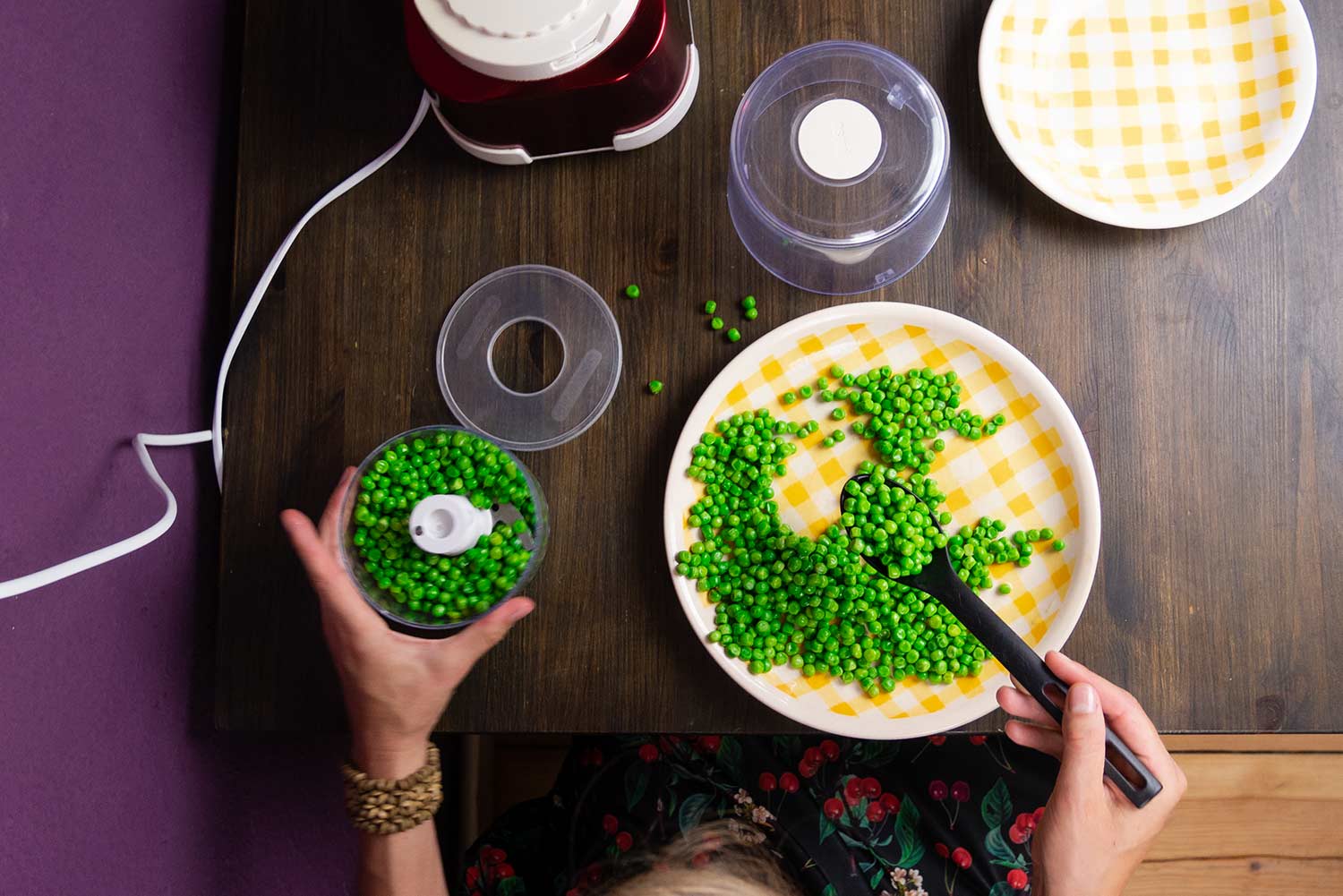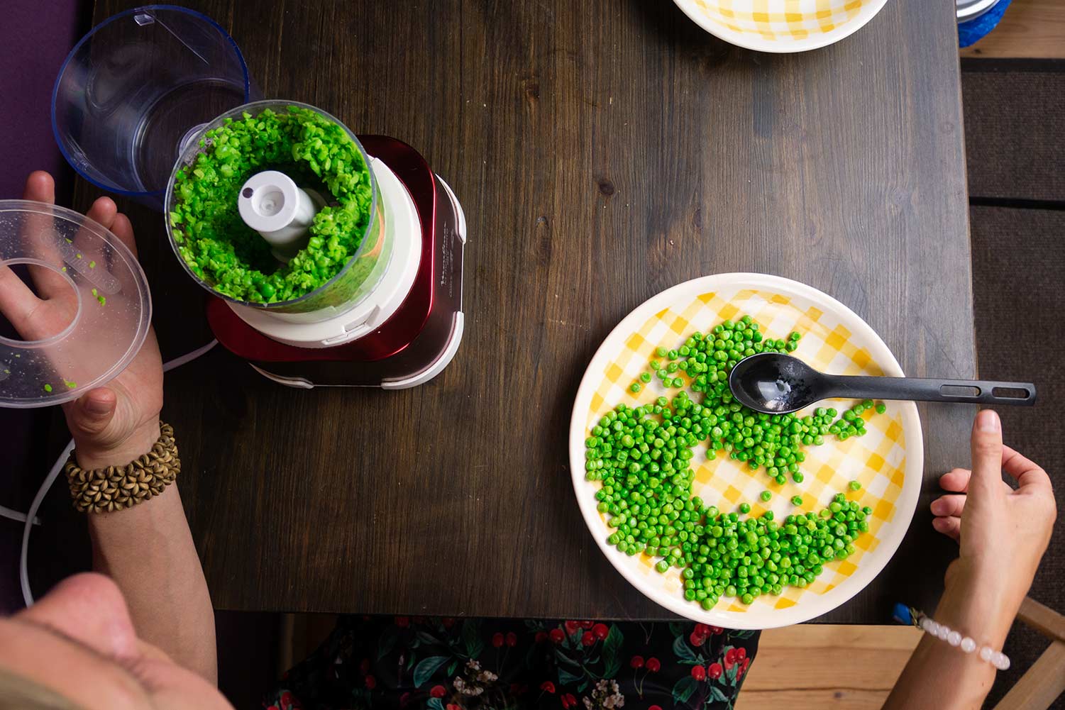 Die abgekühlten Erbsen zerkleinern, damit sie leichter verdaulich sind. Ich nehme dazu gerne eine Moulinette.