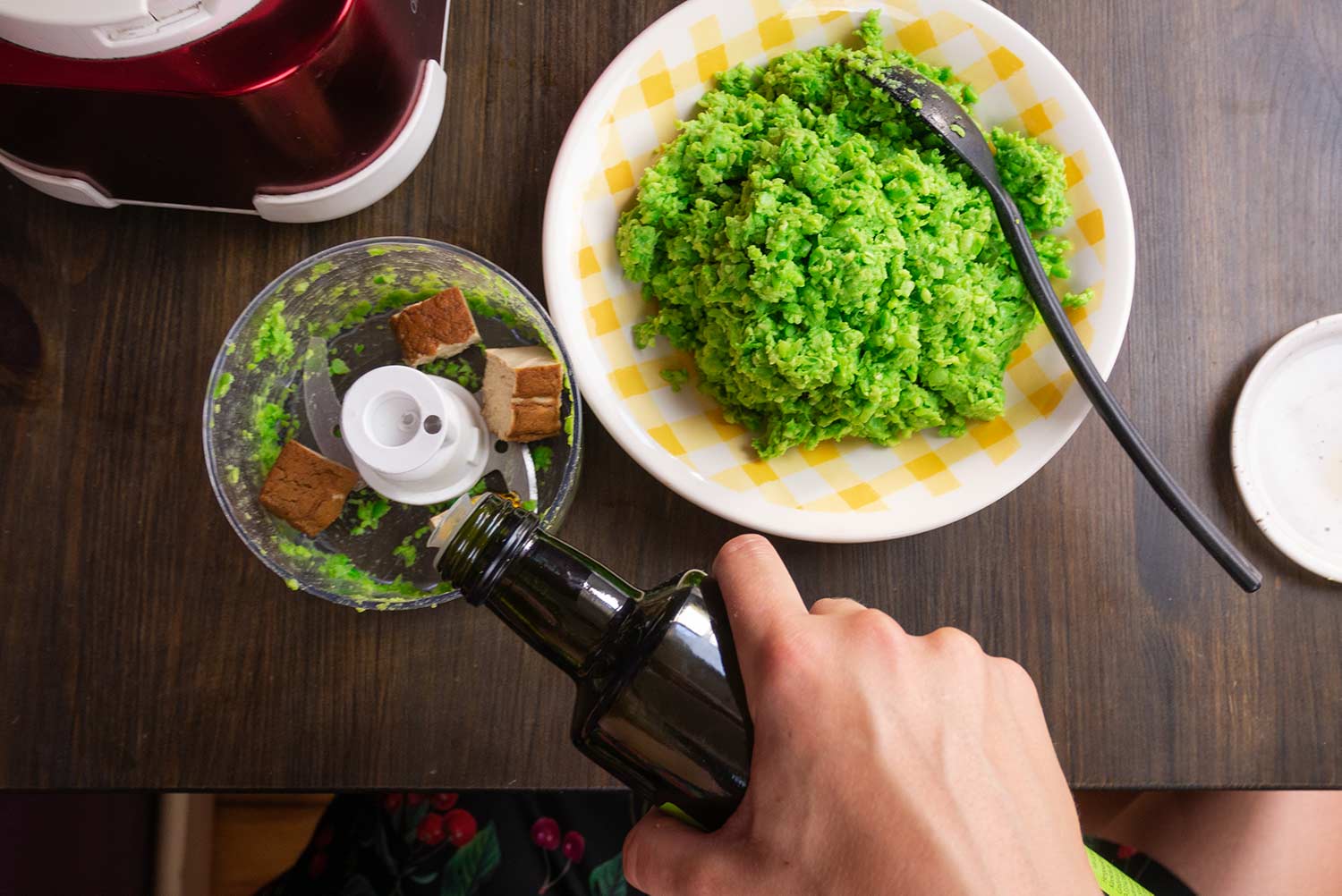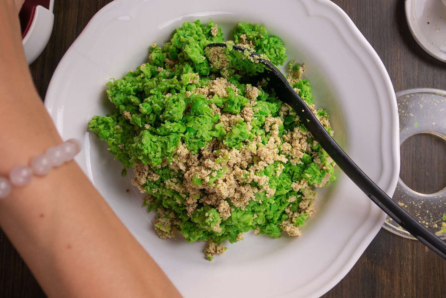 Den Räuchertofu mit dem Öl pürieren und zu den Erbsen geben.