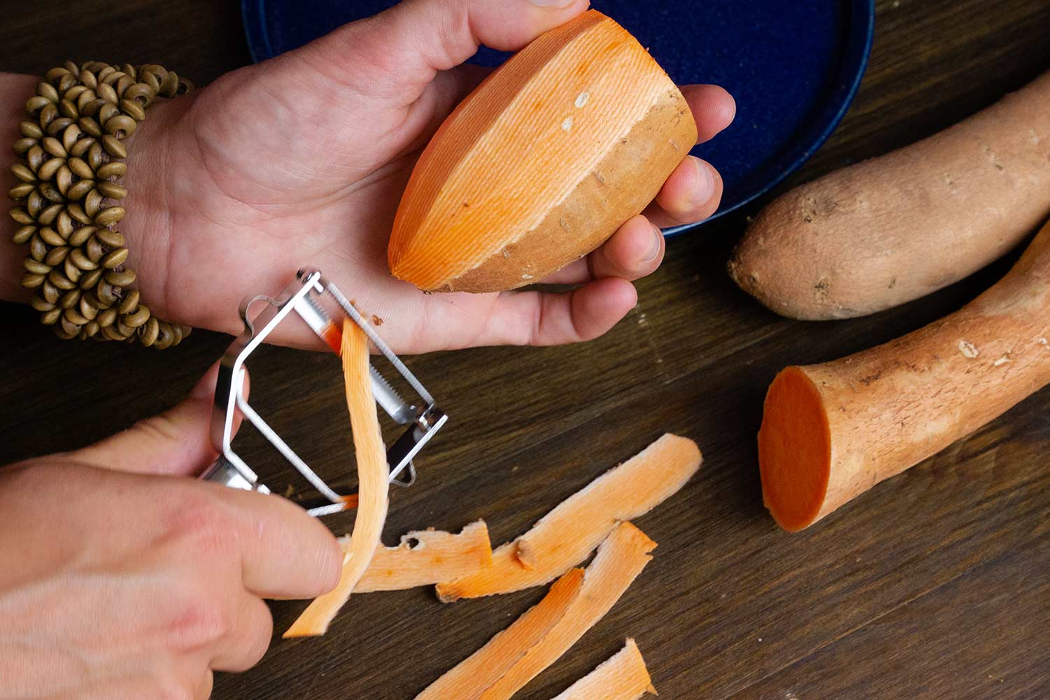 Die Süßkartoffel schälen, in Scheibchen schneiden und in etwas Öl von beiden Seiten anbraten. Leicht salzen und auskühlen lassen.