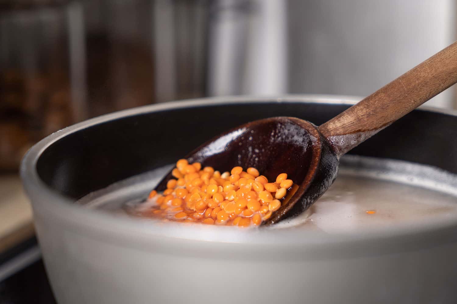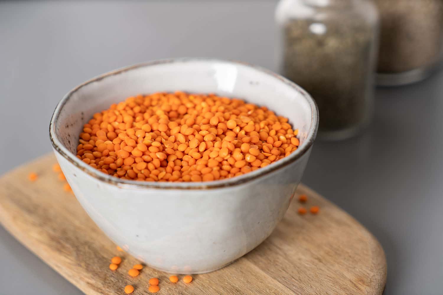 Rote Linsen sind nämlich schon geschält und zerfallen aus diesem Grund beim Kochvorgang sehr schnell von alleine zu Püree.