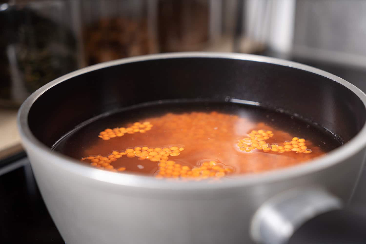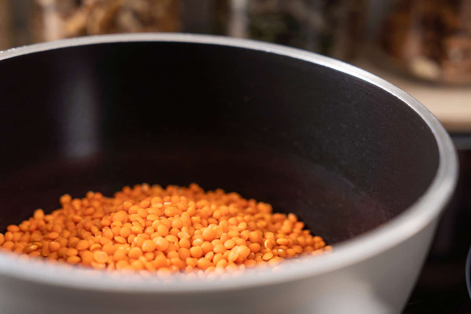 Die roten Linsen in einen Topf geben und waschen.
