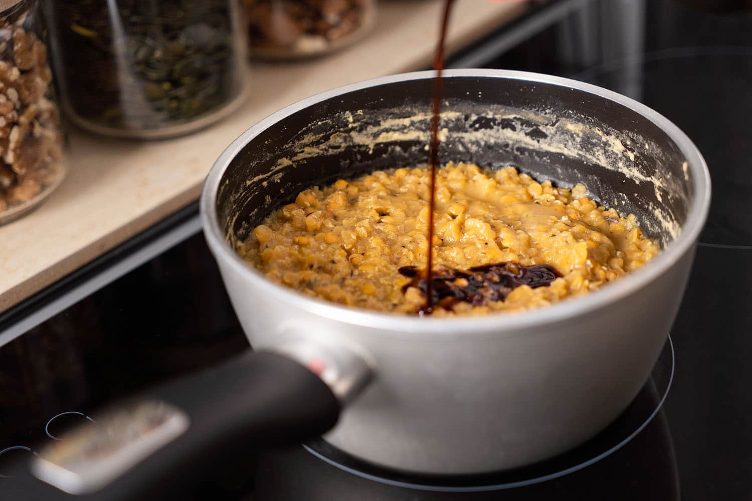 Erst am Ende der Garzeit mit Salz oder Sojasoße abschmecken, da Hülsenfrüchte sonst nicht weich kochen.