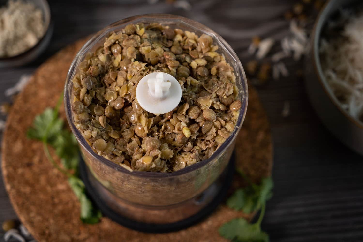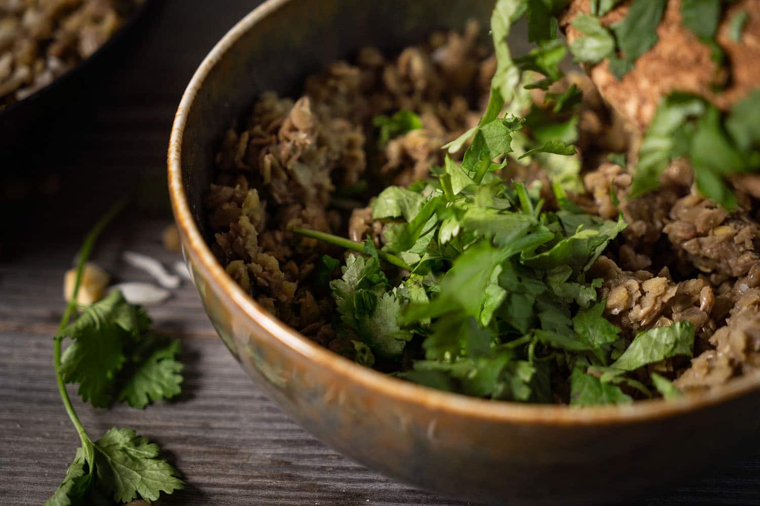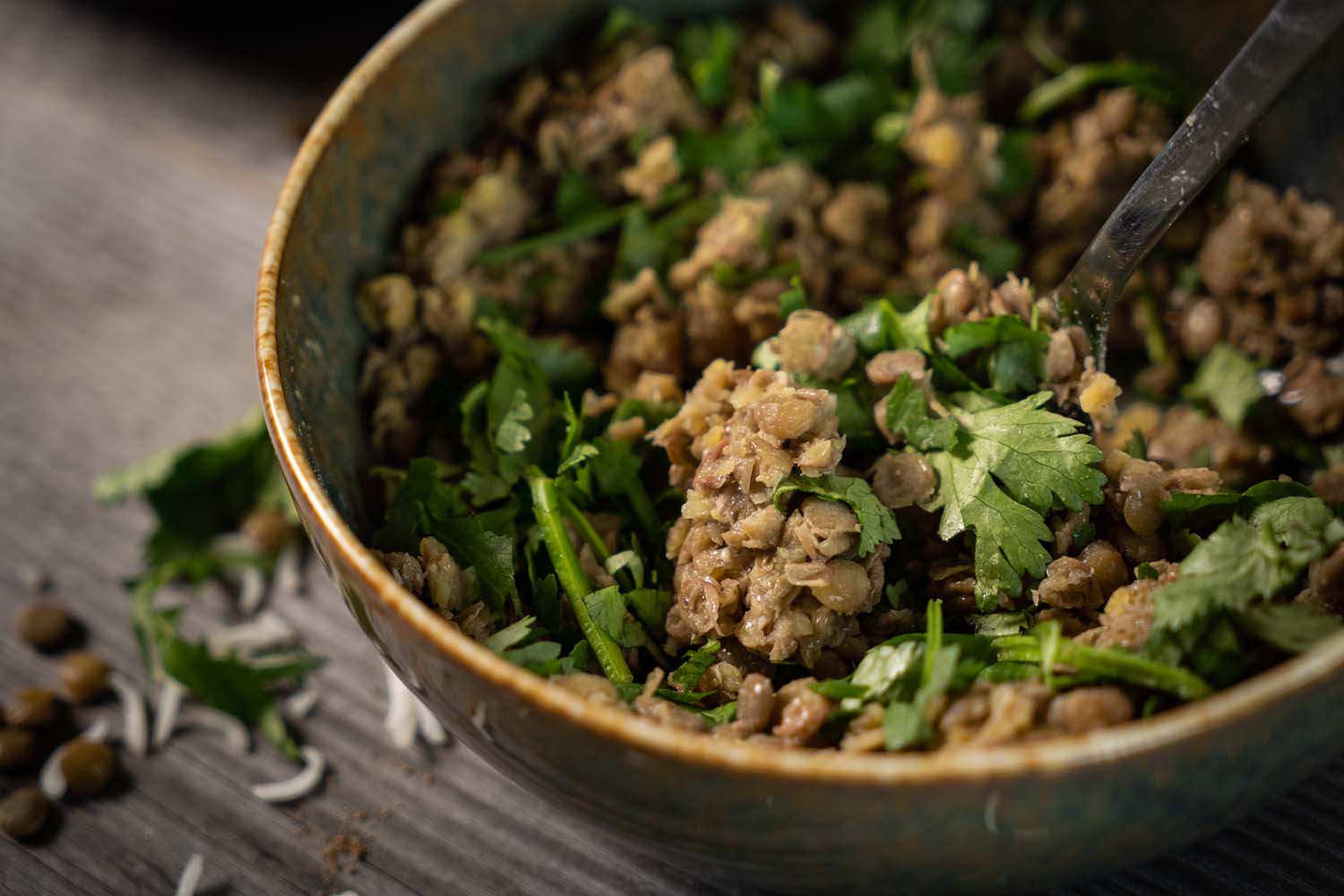 Den frischen Koriander gut zerkleinern und zu den Linsen in die Schüssel geben