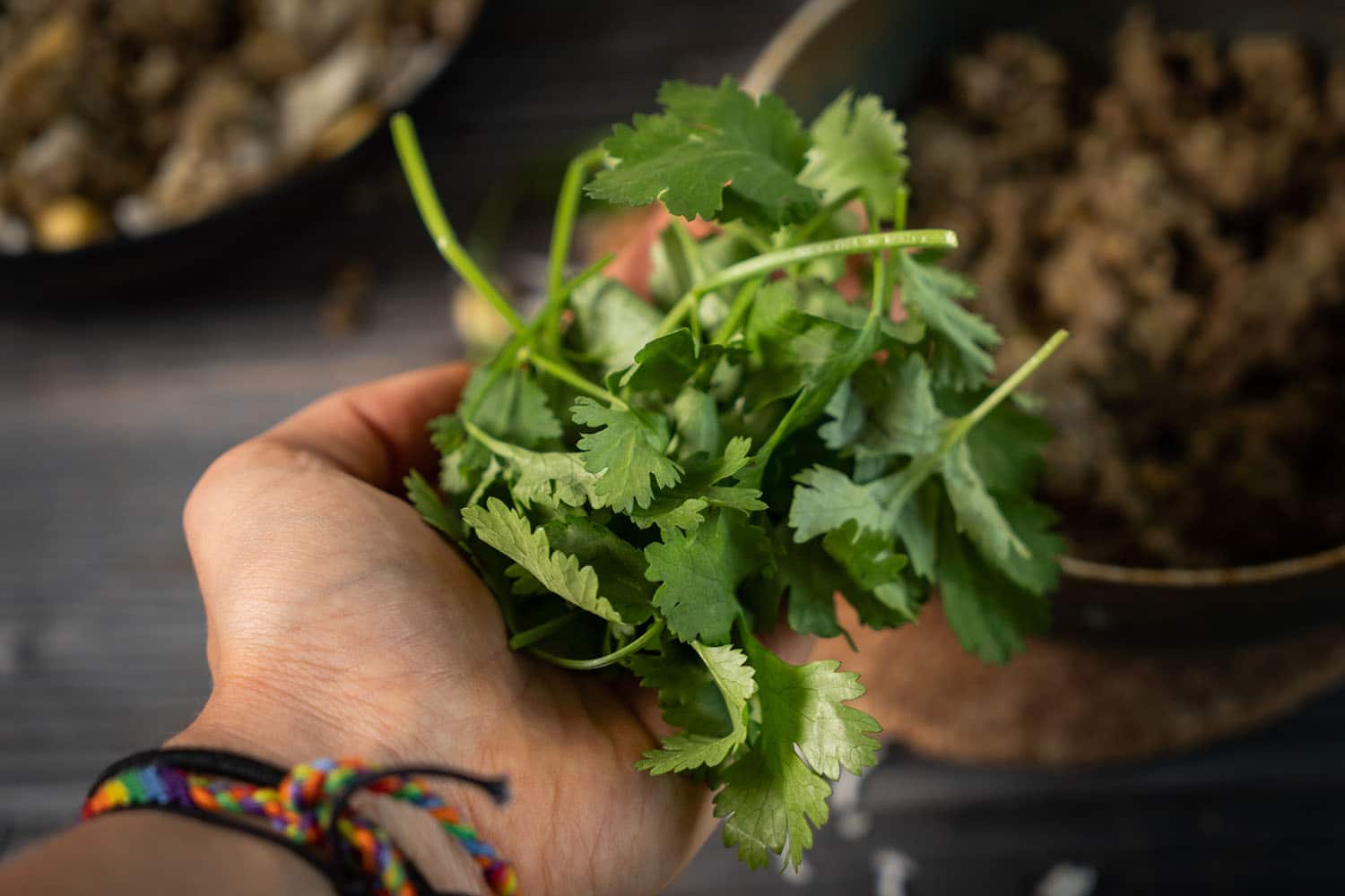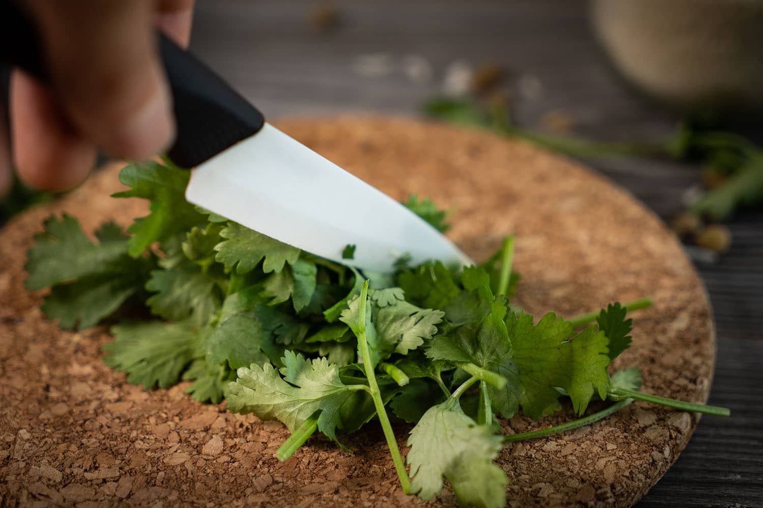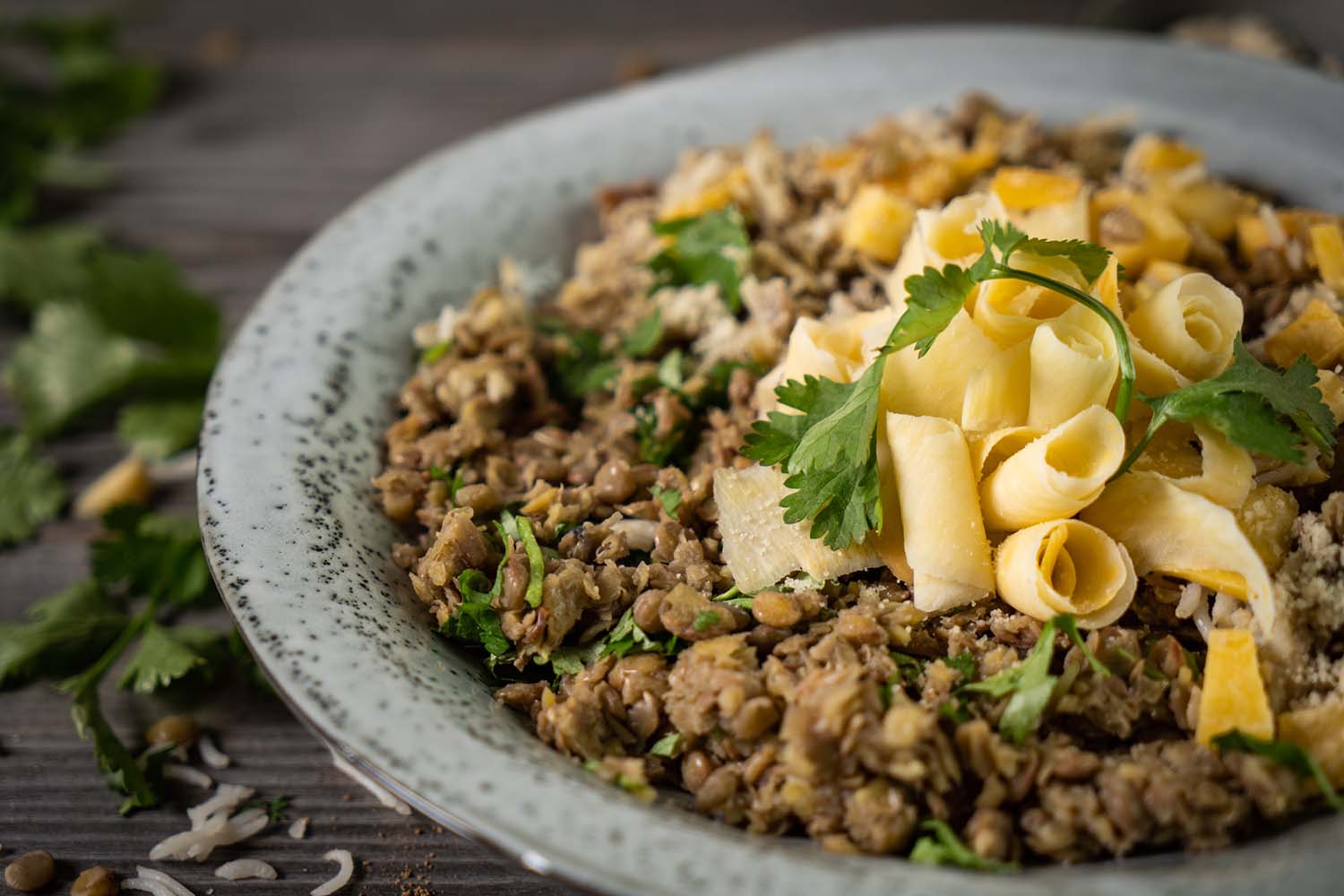 Den frischen Koriander gut zerkleinern und zu den Linsen in die Schüssel geben