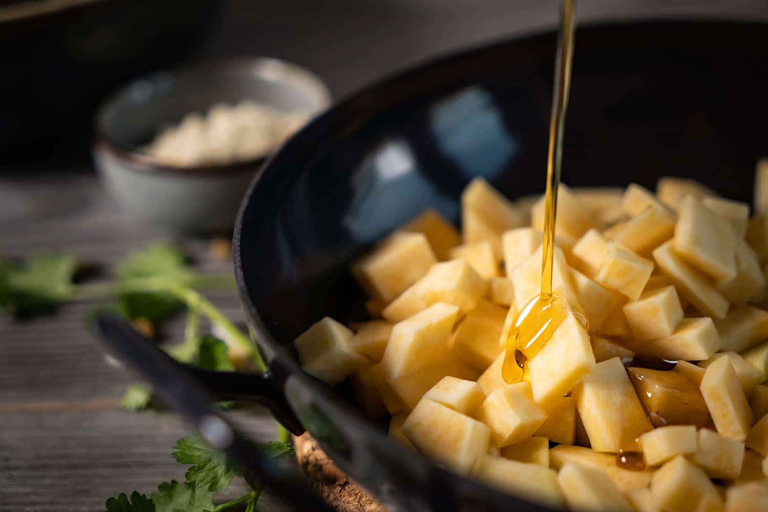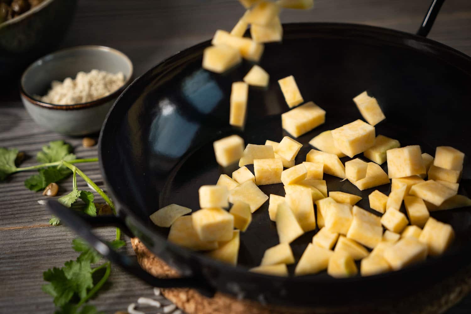 Die Steckrübe schälen, in kleine Stücke schneiden und in einer Pfanne mit dem Sesamöl anbraten, bis sie schön weich sind