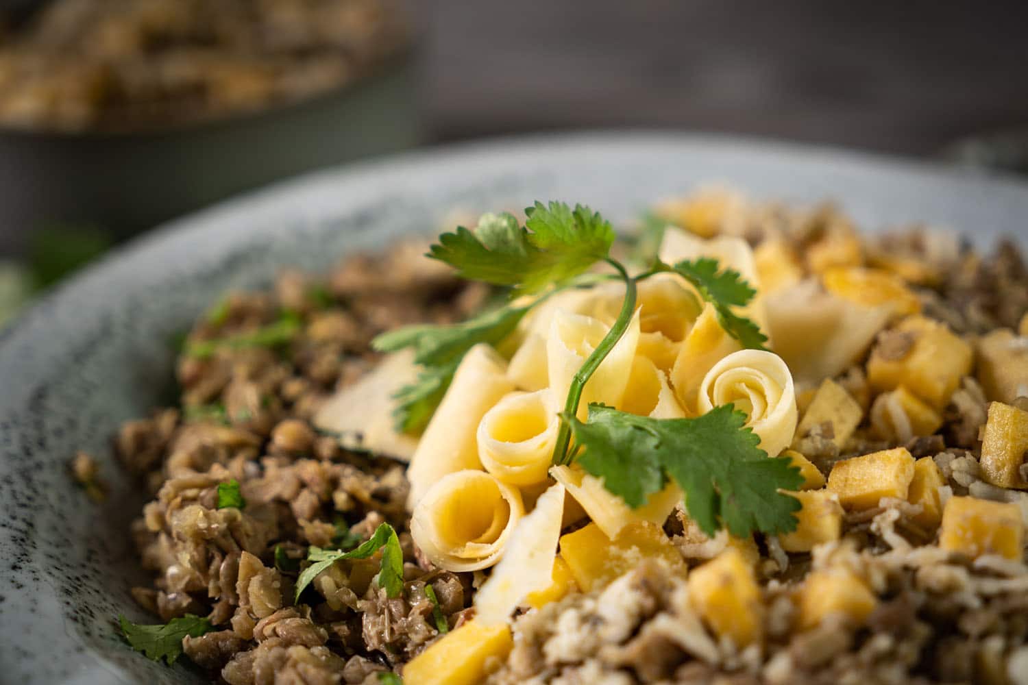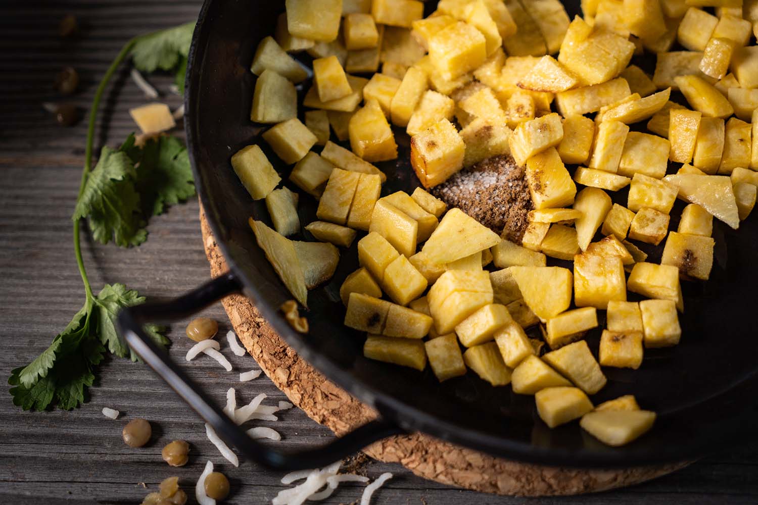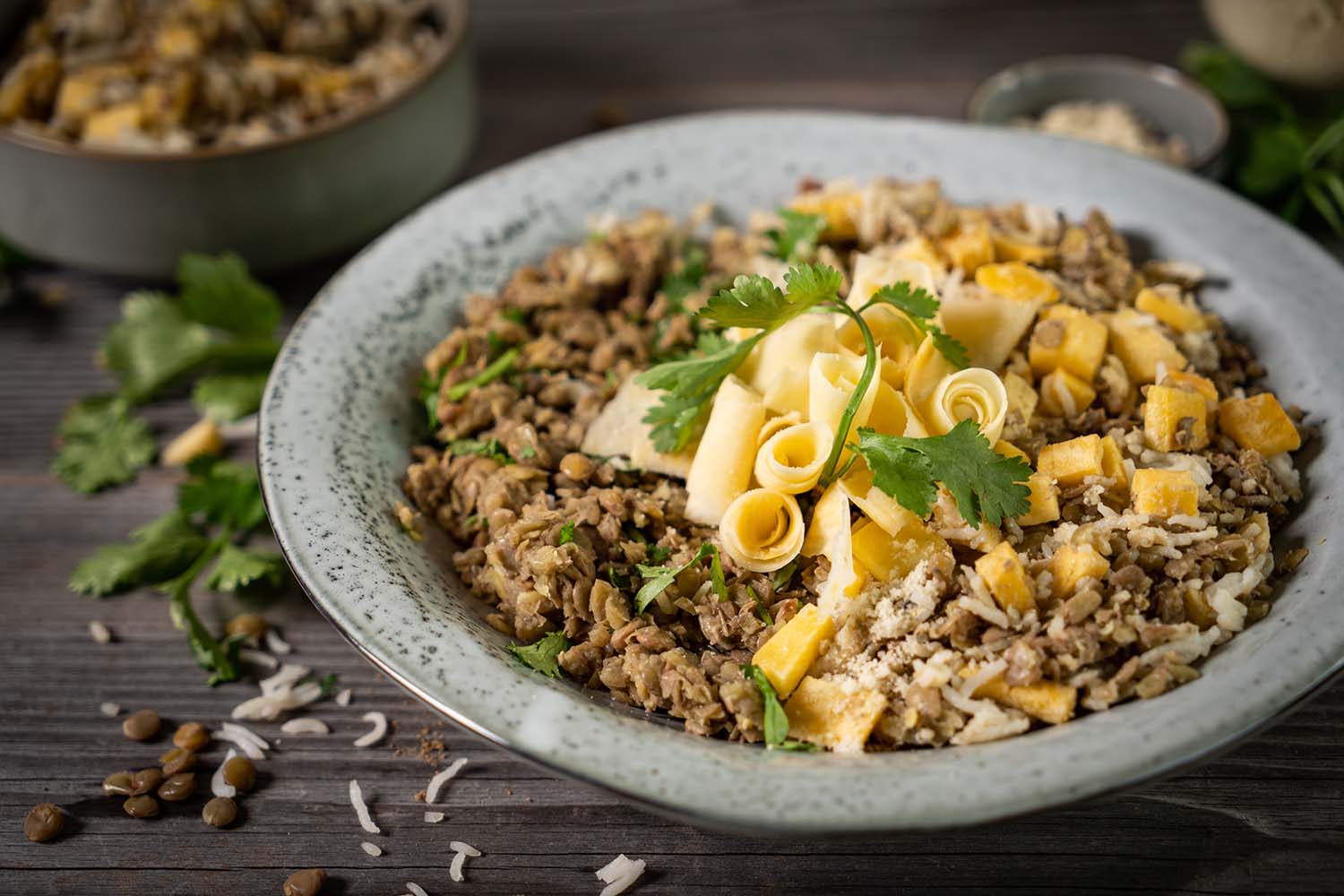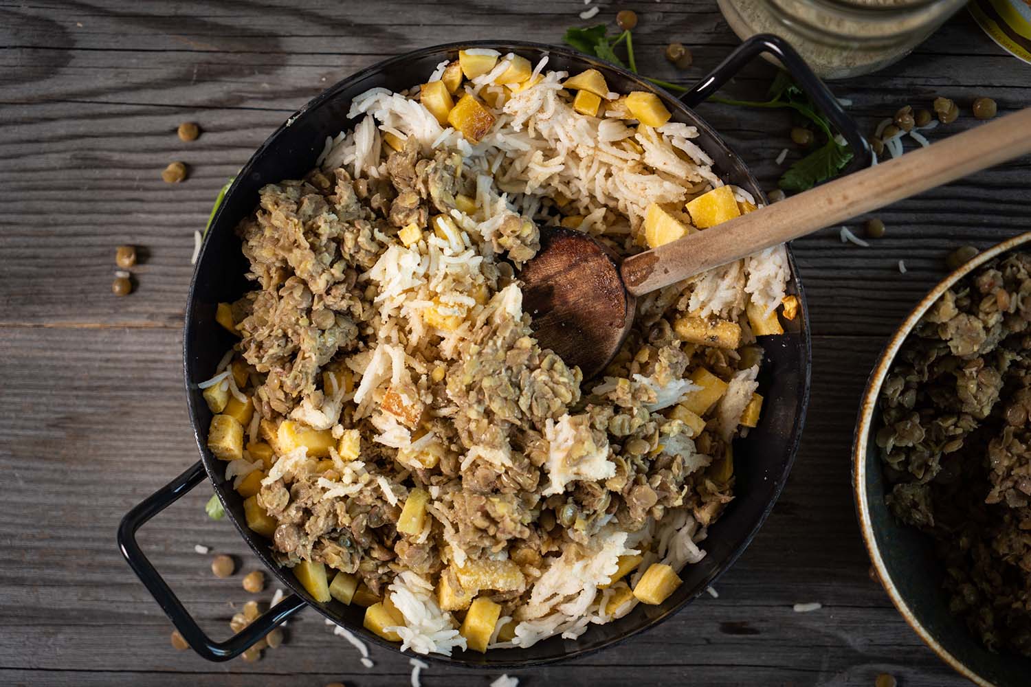 Die Linsen-Koriandermischung zusammen mit der Steckrüben-Reispfanne anrichten und schon ist das herbstlich-winterliche Gericht fertig