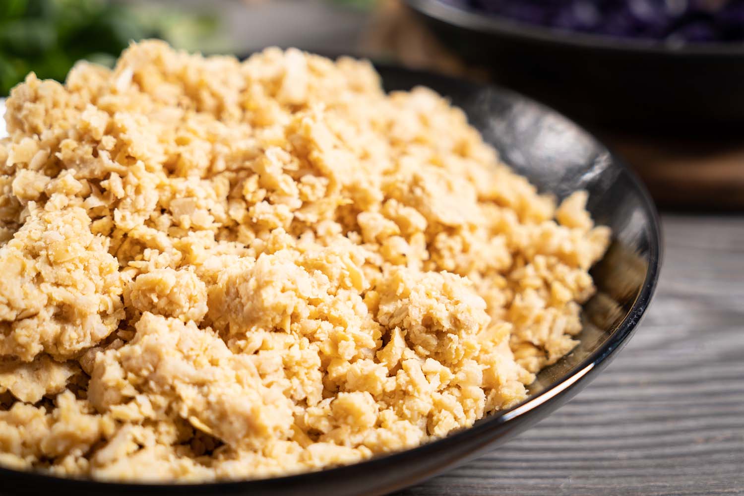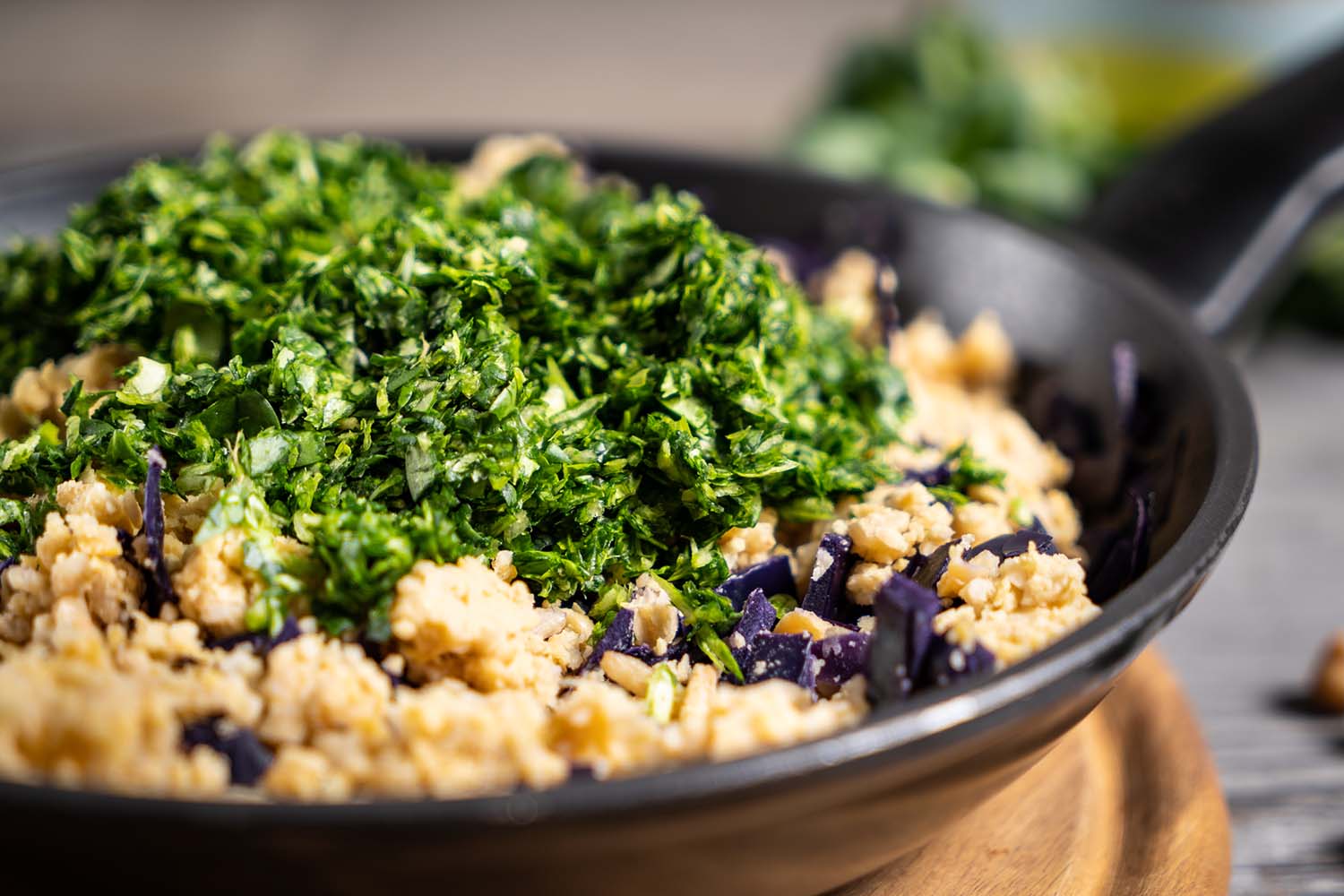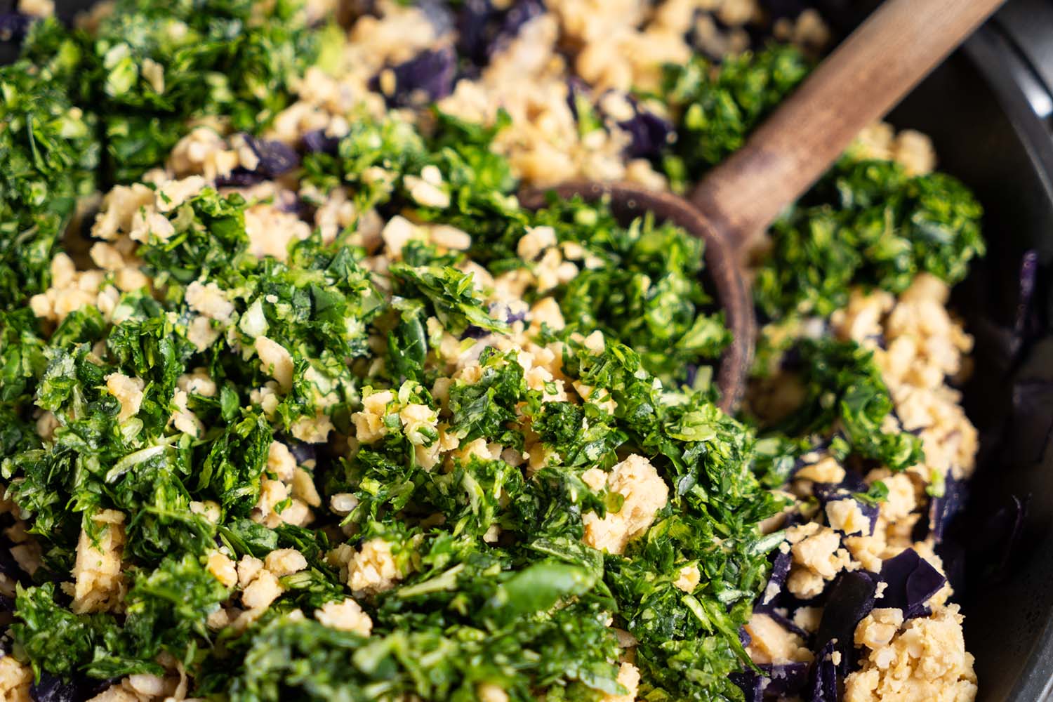 Die Kichererbsen und den Reis in einer “Moulinette” oder mit einem Stampfer zerkleinern und zum Rotkohl geben.
