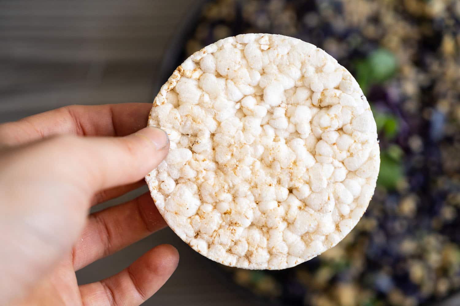 Die Reiswaffel in Stücke brechen und unterheben. Mit Salz würzen. Auf Zimmertemperatur abkühlen lassen.